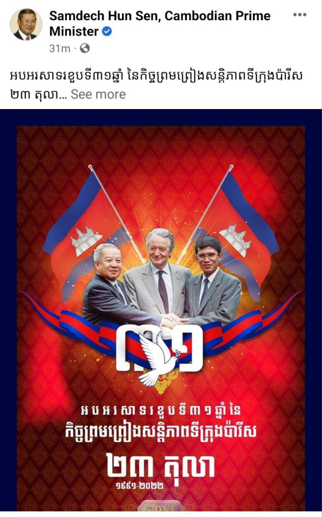 សម្ដេចតេជោ បានសរសេរលើបណ្ដាញសង្គមដូច្នេះថា៖ ថ្ងៃទី២៣ ខែតុលា ឆ្នាំ២០២២ គឺជាខួប ៣១ឆ្នាំ (២៣ តុលា ១៩៩១-២៣ តុលា ២០២២) នៃកិច្ចព្រមព្រៀងសន្តិភាព ទីក្រុងប៉ារីស។ ៣១ឆ្នាំមុន ពោលគឺនៅថ្ងៃទី២៣ ខែតុលា ឆ្នាំ១៩៩១ ភាគីទាំង៤ របស់កម្ពុជារួមមាន សម្តេចតេជោ ហ៊ុន សែន តំណាងឱ្យរដ្ឋាភិបាលកម្ពុជា ចលនាតស៊ូហ៊្វុនស៊ិនប៉ិច ដែលតំណាងដោយសម្តេចព្រះ នរោត្តម សីហនុ និងសម្តេចក្រុមព្រះ នរោត្តម រណប្ញទ្ឋិ រណសិរ្សជាតិរំដោះប្រជាពលរដ្ឋខ្មែរ ដែលតំណាងដោយ លោក សឺន សាន និង ក្រុមចលនាកម្ពុជាប្រជាធិបតេយ្យ (ប៉ុលពត) តំណាងដោយ លោក ខៀវ សំផន បានឈានទៅចុះហត្ថលេខា លើកិច្ចព្រមព្រៀងសន្តិភាព នៅទីក្រុងប៉ារីស ប្រទេសបារាំង ក្រោមវត្តមានសាក្សីមកពី១៨ប្រទេស រួមទាំងអគ្គលេខាធិការអង្គការសហប្រជាជាតិ (UN) ផងដែរ ដើម្បីបញ្ចប់សង្រ្គាមស៊ីវិលនៅកម្ពុជា។