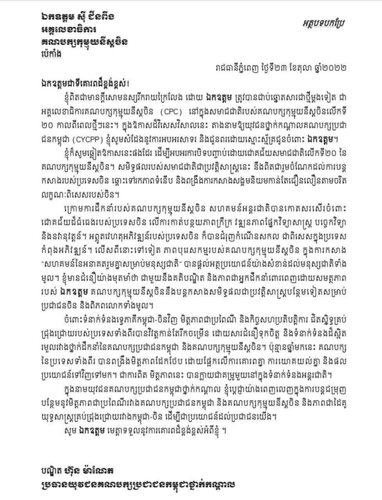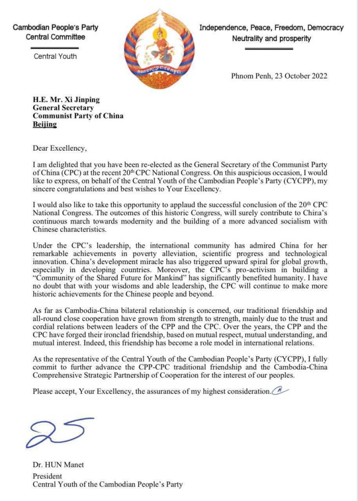 លោក ហ៊ុន ម៉ាណែត អបអរសាទរ លោក Xi Jinping ជាប់ឆ្នោតសាជាថ្មីម្ដងទៀត ជាអគ្គលេខាធិការគណបក្សកុម្មុយនីស្តចិនOne-Minuteអត្ថបទដោយ៖AMS OneMinute #ams1minute AMS OneMinuteអត្ថបទមុនអត្ថបទបន្ទាប់