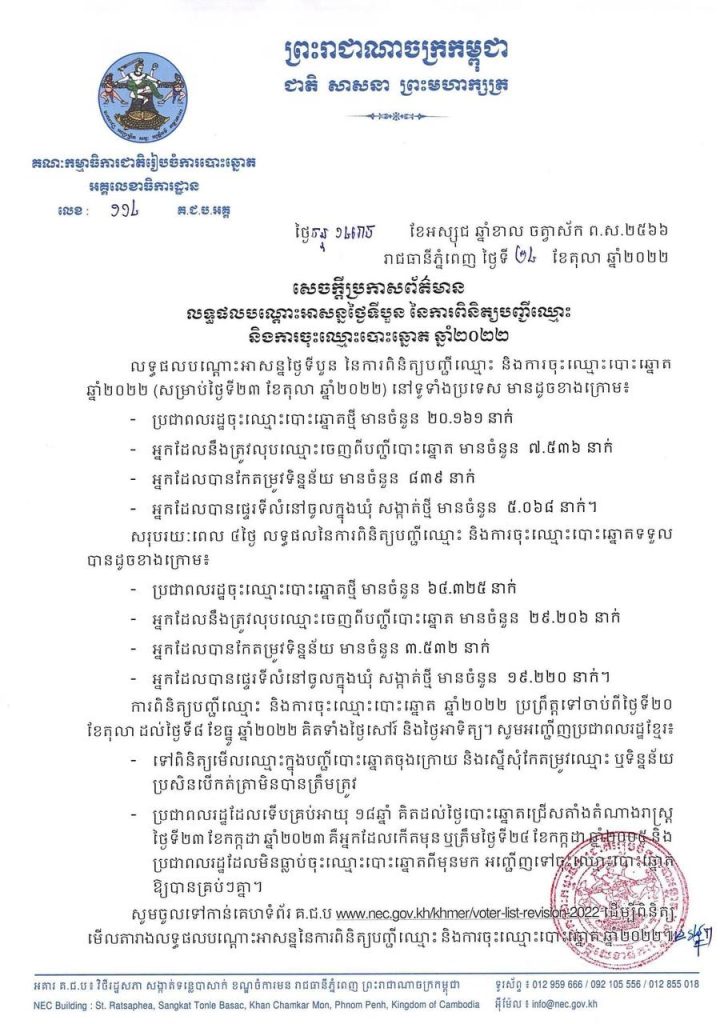 គ.ជ.ប ប្រកាសពីលទ្ធផលថ្ងៃទី៤ នៃការពិនិត្យបញ្ជីឈ្មោះ និងការចុះឈ្មោះបោះឆ្នោតឆ្នាំ២០២២, ពលរដ្ឋចុះឈ្មោះបោះឆ្នោតថ្មី ២០ ១៦១នាក់ទៀតOne-Minuteអត្ថបទដោយ៖AMS OneMinute #ams1minute AMS OneMinuteអត្ថបទមុនអត្ថបទបន្ទាប់