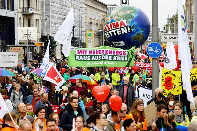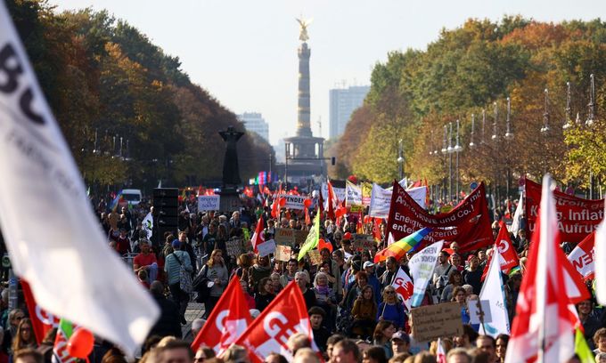 ប៊ែកឡាំង៖ បាតុកររាប់ម៉ឺននាក់ នៅក្នុងទីក្រុងចំនួនប្រាំមួយរបស់អាឡឺម៉ង់ បានប្រមូលផ្តុំគ្នា កាលពីចុងសប្តាហ៍ ដើម្បីទាមទារឱ្យមានការចែកចាយមូលនិធិរដ្ឋាភិបាល ដើម្បីដោះស្រាយការកើនឡើងតម្លៃថាមពល និងឡើងថ្លៃទំនិញ សេវាកម្ម សម្រាប់ការរស់នៅ។