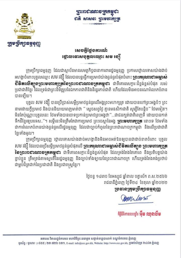 ក្រុមប្រឹក្សាធម្មនុញ្ញ ថ្កោលទោសយ៉ាងដាច់អហង្កានិងមិនអាចអត់ឱនឱ្យបានជាដាច់ខាតចំពោះបុគ្គល សម រង្ស៊ី ដែលបានប្រើសម្តីប្រមាថធ្ងន់ធ្ងរបំផុតលើ ព្រះករុណាជាអម្ចាស់ជីវិតលើត្បូង ព្រះមហាក្សត នៃព្រះរាជាណាចក្រកម្ពុជា ជាទីគោរពសក្ការៈដ៏ខ្ពង់ខ្ពស់បំផុត ដែលទ្រង់តែងតែគោរព និងប្រតិបត្តយ៉ាងខ្ជាប់ខ្ជួន ត្រឹមត្រង់តាមស្មារតីនៃរដ្ឋធម្មនុញ្ញ និងច្បាប់ទាំងឡាយនៃព្រះរាជាណាចក្រ ហើយទ្រង់តែងគង់ប្រថាប់ ជាម្លប់ដ៏ត្រជាក់នៃប្រជាជាតិ និងប្រជារាស្ត្រខ្មែរ៕