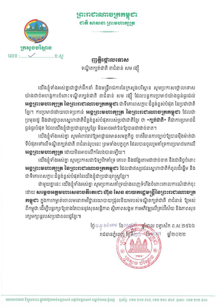ភ្នំពេញ៖យើងខ្ញុំទាំងអស់គា្នជាថ្នាក់ដឹកនាំ និងមន្ត្រីរាជការនៃក្រសួងបរិស្ថានសូមប្រកាសថ្កោលទោស យ៉ាងដាច់អហង្កការចំពោះទណ្ឌិតក្បត់ជាតិ ៣ជំនាន់ សម រង្ស៊ី ដែលបន្តការប្រមាថយ៉ាងធ្ងន់ធ្ងរដល់ អង្គព្រះមហាក្សត្រ នៃព្រះរាជាណាចក្រកម្ពុជា ជាទីគោរពសក្ការៈដ៏ខ្ពង់ខ្ពស់បំផុត នៃប្រជាជាតិ ខ្មែរ។ ការប្រមាថដោយចោទប្រកាន់ អង្គព្រះមហាក្សត្រនៃព្រះរាជាណាចក្រកម្ពុជា ដែលជាប្រមុខរដ្ឋ និងជារដ្ឋបុរសស្នេហាជាតិដ៏ខ្ពង់ខ្ពស់បំផុតរបស់ប្រជាជាតិខ្មែរ ថា «ក្បត់ជាតិ» គឺជាការប្រមាថដ៏ធ្ងន់ធ្ងរបំផុត ដែលយើងខ្ញុំជាប្រជានុរាស្ត្រខ្មែរមិនអាចអត់ឱនឱ្យបានជាដាច់ខាត។នេះបើយោងតាមញត្តិថ្កោលទោសទណ្ឌិតក្បត់ជាតិ៣ជំនាន់សមរង្ស៊ី នៃក្រសួងបរិស្ថាននៅថ្ងៃទី២៤ខែតុលាឆ្នាំ២០២២នេះ។