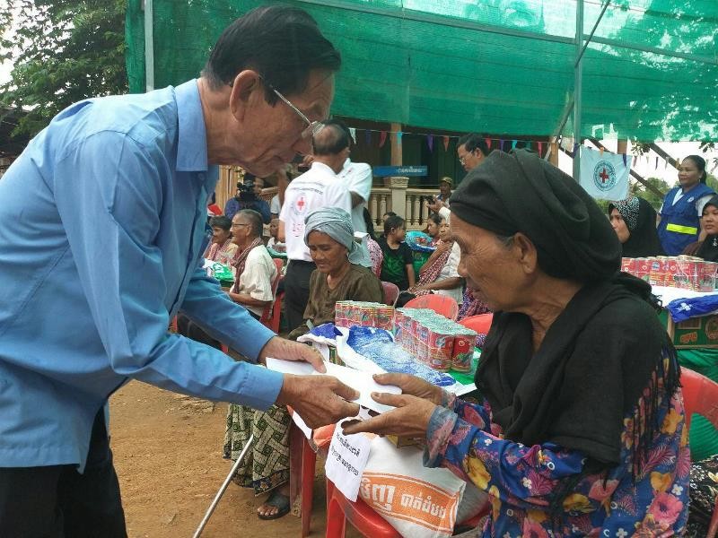អំណោយដែលកាកបាទក្រហមកម្ពុជា ផ្តល់ជូនក្នុងមួយគ្រួសារទទួលបាន៖ មី១កេស ត្រីខ១០កំប៉ុង អង្ករ២៥គីឡូក្រាម និងមុង១។ មានប្រសាសន៍នៅក្នុងពិធីជួបសំណេះសំណាលជាមួយប្រជាពលរដ្ឋរងគ្រោះ ឯកឧត្តមវេជ្ជបណ្ឌិត អ៊ុយ សំអាត និងឯកឧត្តម វ៉ា ថន បាននាំនូវប្រសាសន៍របស់សម្តេចកិត្តិព្រឹទ្ធបណ្ឌិតប្រធាន ដែលបានផ្ដាំផ្ញើសួរសុខទុក្ខ ក្តីនឹករលឹក ការស្រឡាញ់ យ៉ាងជ្រាលជ្រៅ និងគិតគូរជានិច្ច ចំពោះសុខទុក្ខរបស់ប្រជាពលរដ្ឋទាំងអស់ ដែលជួបគ្រោះទឹកជំនន់ នៅក្នុងរដូវវស្សានេះ។