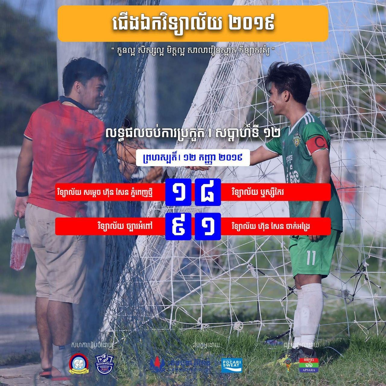 ឈានដល់សប្តាហ៍ទី១២ នៃការប្រកួតបាល់ទាត់ជ្រើសរើសជើងឯកសិស្សវិទ្យាល័យ លើកទី១ ឆ្នាំ២០១៩ ក្រុមវិទ្យាល័យហ៊ុនសែន ចាក់អង្រែ នៅតែបន្តឈរបាតតារាងក្រោយចាញ់ ម្ចាស់ផ្ទះច្បារអំពៅ ១ទល់នឹង៩ ខណៈកីឡាករ សួន សុភ័ក្រ្តា រកបាន៧គ្រាប់ម្នាក់ឯង ចំណែកវិទ្យាល័យ ឬស្សីកែវ ទទួលបាន៣ពិន្ទុបន្ថែម ឡើងឈរកំពូលតារាងបណ្តោះអាសន្ន បន្ទាប់ពីយកឈ្នះវិទ្យាល័យ ភ្នំពេញថ្មី ៨ទល់នឹង១ នៅទីលានវិទ្យាល័យ បឹងត្របែក ។