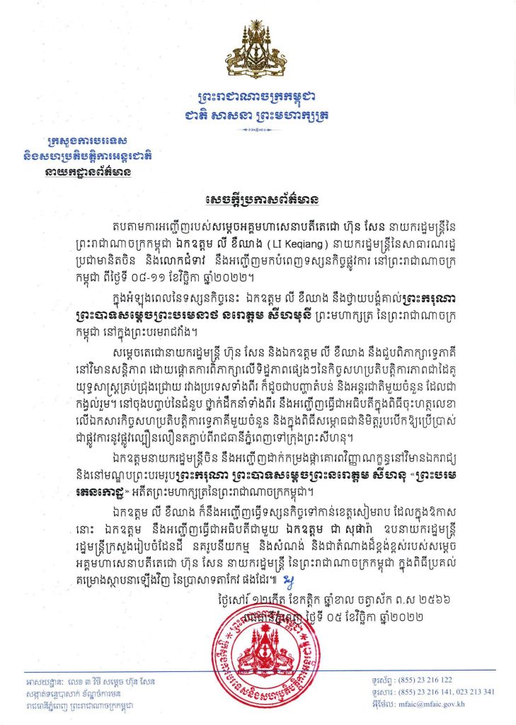 ភ្នំពេញ៖ តបតាមការអញ្ជើញរបស់សម្តេចអគ្គមហាសេនាបតីតេជោ ហ៊ុន សែន នាយករដ្ឋមន្រ្តីនៃព្រះរាជាណាចក្រកម្ពុជា ឯកឧត្តម លី ខឺឈាង (LI Keqiang) នាយករដ្ឋមន្រ្ដី នៃសាធារណរដ្ឋប្រជាមានិតចិន និងលោកជំទាវ នឹងអញ្ជើញមកបំពេញទស្សនកិច្ចផ្លូវការ នៅព្រះរាជាណាចក្រកម្ពុជា ពីថ្ងៃទី ០៨-១១ ខែវិច្ឆិកា ឆ្នាំ២០២២។ នេះបើយោងតាមសេចក្តីប្រកាសព័ត៌មានរបស់ក្រសួងការបរទេស និងសហប្រតិបត្តិការអន្តរជាតិ នៅថ្ងៃទី០៥ ខែវិច្ឆិកា ឆ្នាំ២០២២។