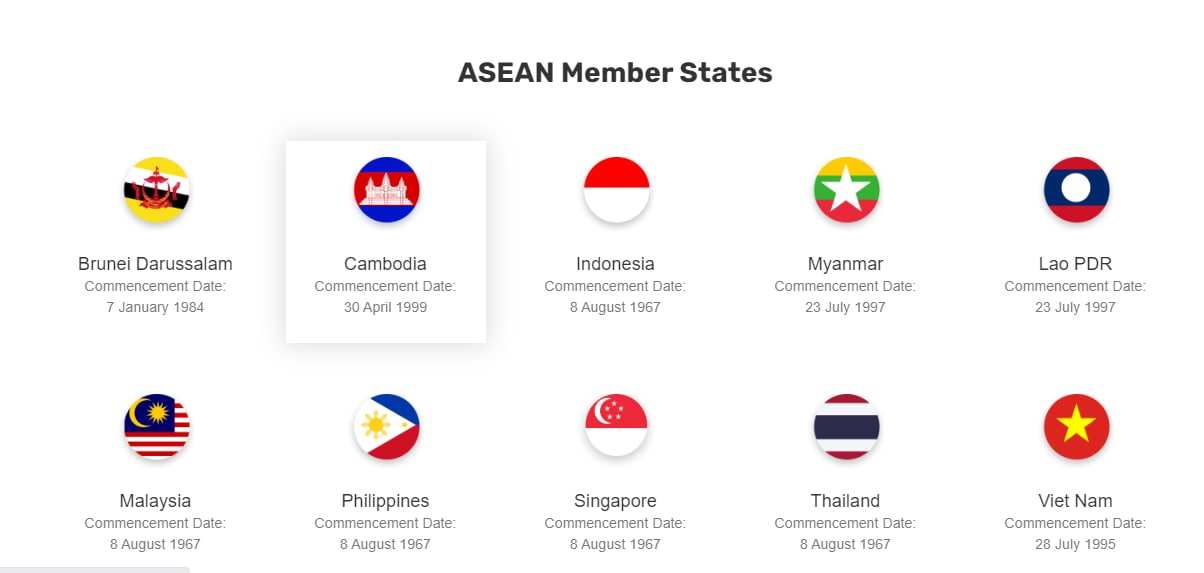 គួររំលឹកថា កម្ពុជាបានចូលជាសមាជិកពេញសិទ្ធិនៃក្រុមប្រទេសអាស៊ាននៅថ្ងៃទី៣០ ខែមេសា ឆ្នាំ១៩៩៩។ សមាគមប្រជាជាតិអាស៊ីអាគ្នេយ៍ ឬហៅកាត់ថា អាស៊ាន (ASEAN) គឺជាអង្គការថ្នាក់តំបន់មួយ រួមមាន ប្រទេសនៅអាស៊ីអាគ្នេយ៍ទាំង១០ជាសមាជិក ត្រូវបានបង្កើតឡើងដើម្បីជួយជំរុញកិច្ចសហប្រតិបត្តិការអន្តររដ្ឋាភិបាល និងជួយសម្រួលការធ្វើសមាហរណកម្មក្នុងចំណោមសមាជិកទាំងអស់។