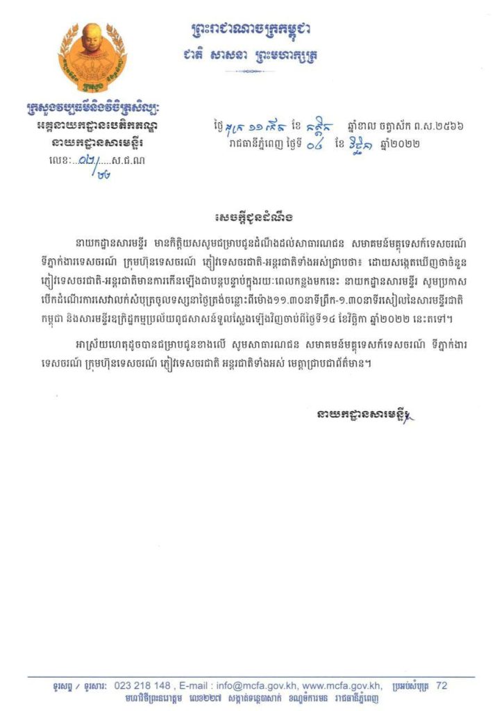 សូមរំឭកថា តាមរយៈការថយចុះនៃចំនួនភ្ញៀវទេសចរ ជាពិសេសទេសចរបរទេសដែលចូលមកទស្សនានៅកម្ពុជា ក្នុងអំឡុងពេលជំងឺកូវីដ-១៩ អុកឡុកប្រទេសកម្ពុជា ក្រសួងវប្បធម៌និងវិចិត្រសិល្បៈបានសម្រេចបិទការចូលទស្សនាសារមន្ទីរជាតិ និងផ្អាកដំណើរការរោងភាពយន្តនៅទូទាំងប្រទេស កាលពីខែវិច្ឆិកាឆ្នាំ២០២០។