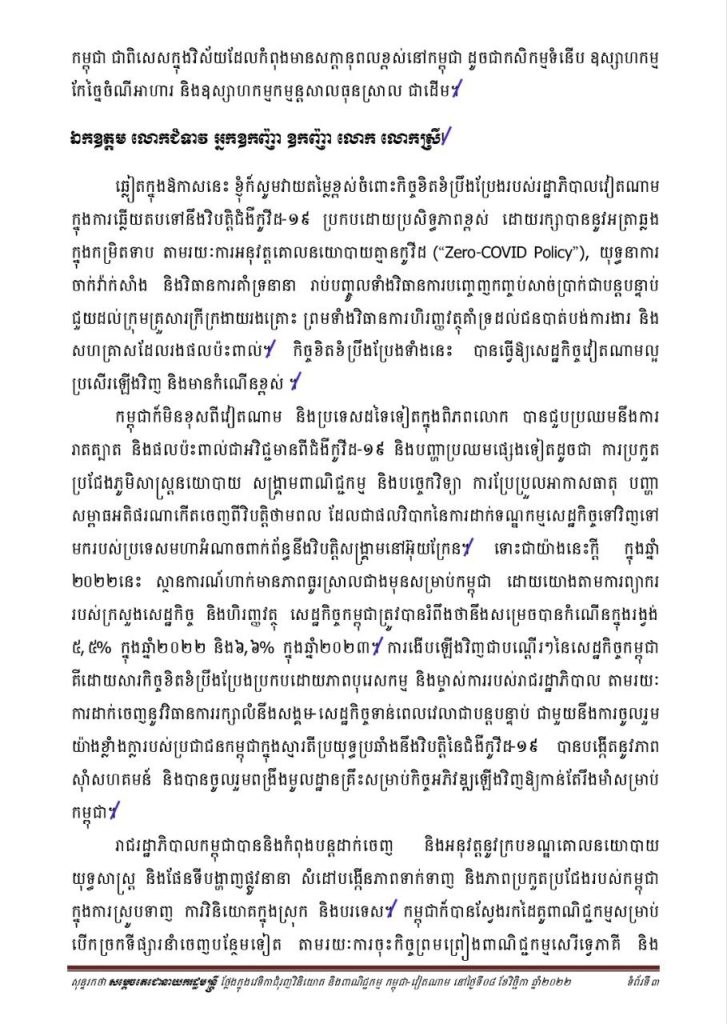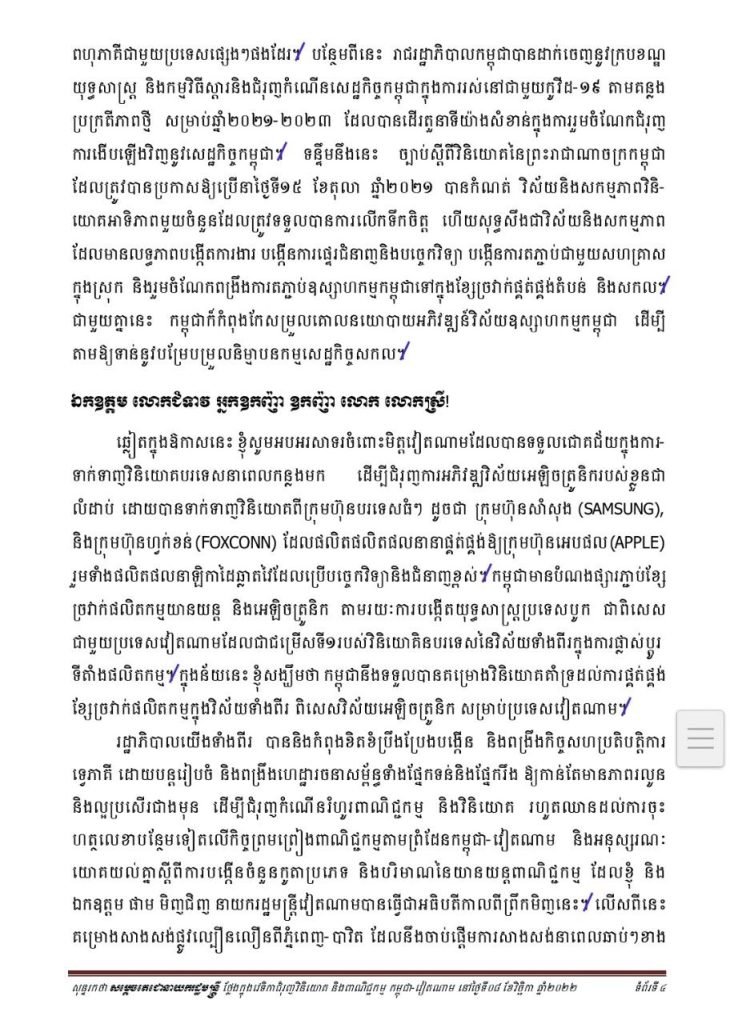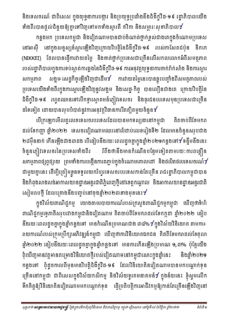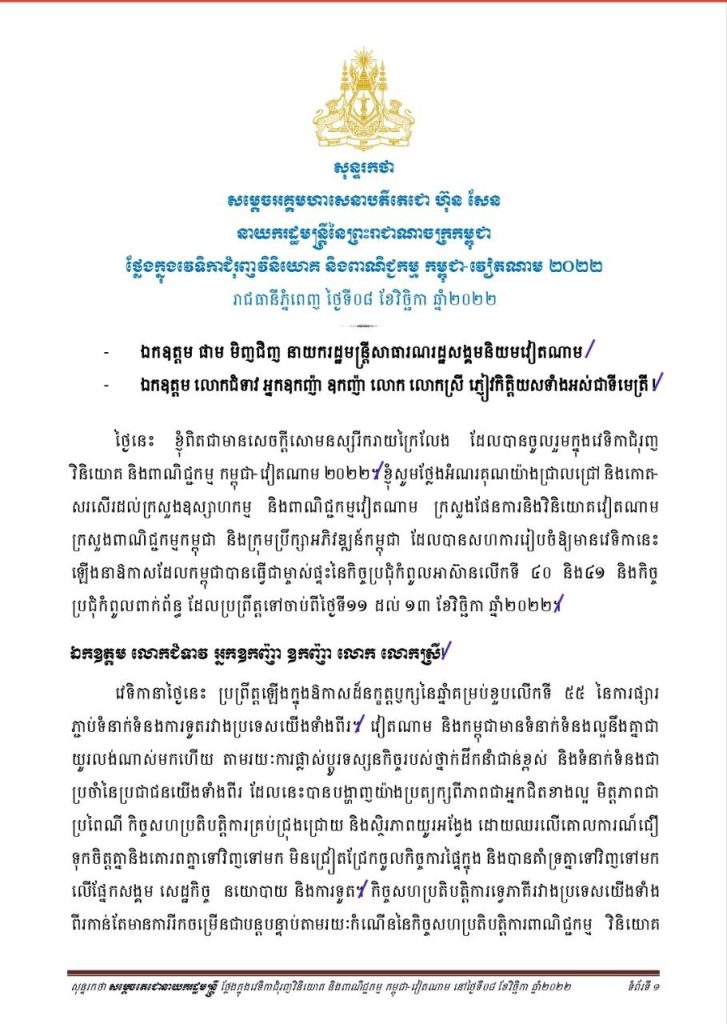 សុន្ទរកថារបស់ សម្តេចតេជោ ហ៊ុន សែន នាយករដ្ឋមន្ត្រីកម្ពុជា ថ្លែងក្នុងវេទិកាជំរុញវិនិយោគ និងពាណិជ្ជកម្ម កម្ពុជា-វៀតណាម ឆ្នាំ២០២២ ថ្ងៃទី០៨ ខែវិច្ឆិកា ឆ្នាំ២០២២។