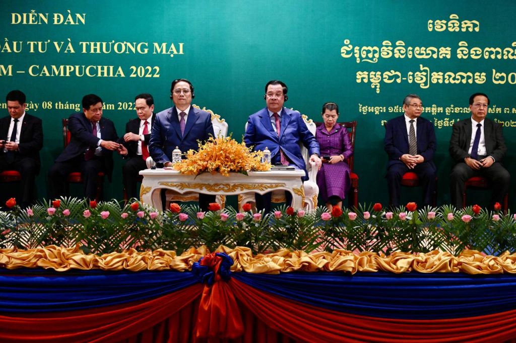 ភ្នំពេញ៖ នៅរសៀលថ្ងៃទី៨ ខែវិច្ឆិកា ឆ្នាំ២០២២ សម្ដេចអគ្គមហាសេនាបតីតេជោ ហ៊ុន សែន នាយករដ្ឋមន្ត្រី នៃព្រះរាជាណាចក្រកម្ពុជា និងឯកឧត្តម ផាម មិញជិញ(Pham Minh Chinh) នាយករដ្ឋមន្ត្រី នៃសាធារណរដ្ឋសង្គមនិយមវៀតណាម បានអញ្ជើញជាអធិបតីនៅក្នុងវេទិកាជំរុញការវិនិយោគ និងពាណិជ្ជកម្មកម្ពុជាវៀតណាម ២០២២ ដែលប្រារព្ធធ្វើឡើងនៅសណ្ឋាគារភ្នំពេញ។ វេទិកាវិនិយោគ និងពាណិជ្ជកម្មកម្ពុជាវៀតណាមឆ្នាំ២០២២នេះរៀបចំឡើងដើម្បីពង្រឹង និងពង្រីកបន្ថែមទៀតនូវកិច្ចសហប្រតិបត្តិការវិនិយោគ និងពាណិជ្ជកម្ម រវាងព្រះរាជាណាចក្រកម្ពុជា និងសាធារណរដ្ឋសង្គមនិយមវៀតណាម នាឱកាសដំណើរទស្សនកិច្ចរបស់ឯកឧត្តម ឯកឧត្តម ផាម មិញជិញ(Pham Minh Chinh) នាយករដ្ឋមន្ត្រីសាធារណរដ្ឋសង្គមនិយមវៀតណាមពីថ្ងៃទី ៨ ដល់ទី៩ ខែវិច្ឆិកា ឆ្នាំ២០២២ នៅព្រះរាជាណាចក្រកម្ពុជា។