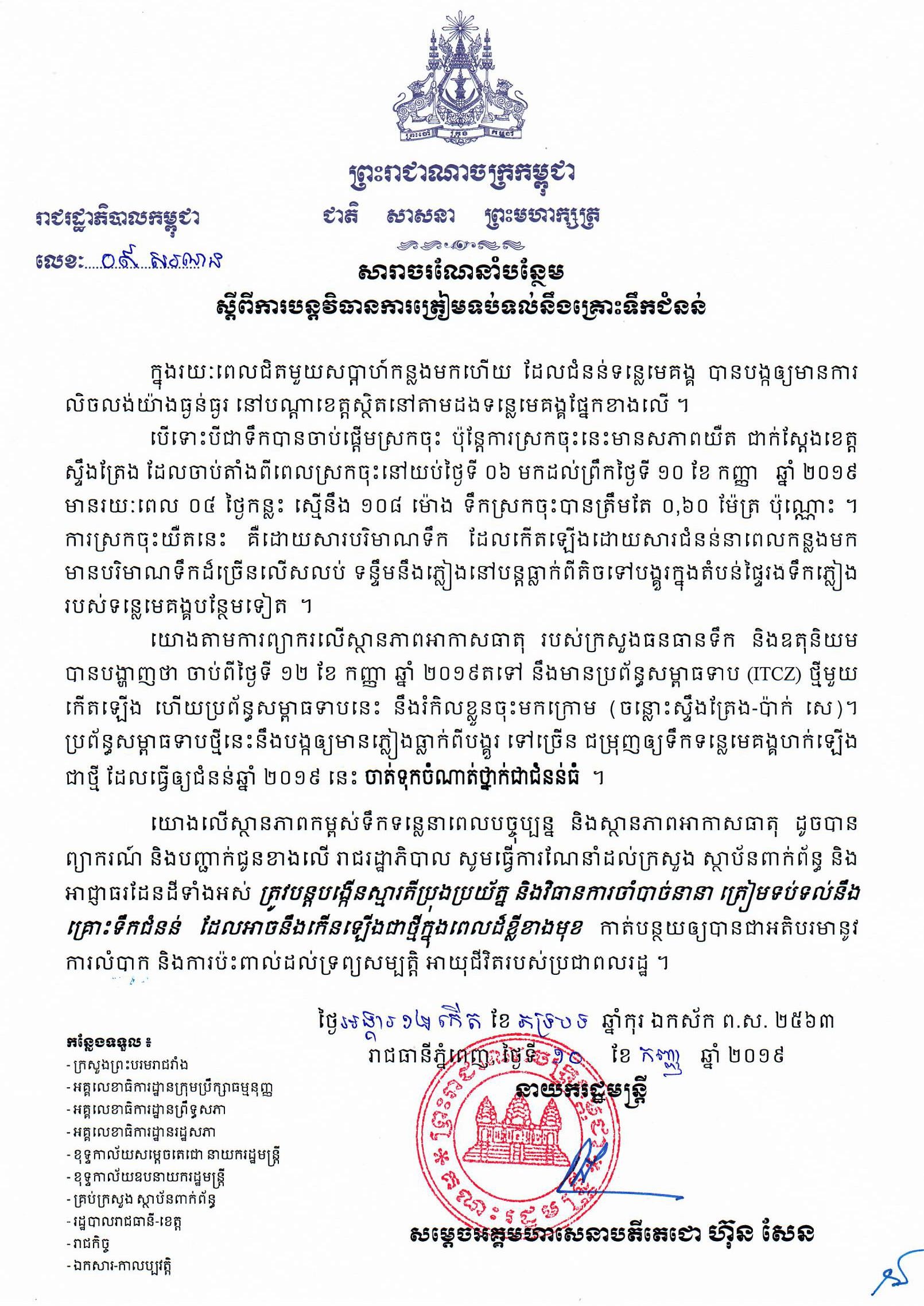 រាជរដ្ឋាភិបាលបានថ្លែងដាស់តឿនពលរដ្ឋត្រូវប្រុងប្រយ័ត្នករណីគ្រោះទឹកជំនន់ និងបានចាត់ទុកទឹកជំនន់ទន្លេ មេគង្គឆ្នាំ២០១៩ គឺជំនន់ដ៏ធំមួយ។ យោងតាមសារាចរណែនាំថ្ងៃទី១០កញ្ញាឆ្នាំ២០១៩ កម្ពុជានឹងរងប្រព័ន្ធសម្ពាធ ទាប ITCZ ថ្មីមួយទៀត ក្នុងពេលដែលកម្ពស់ទឹកទន្លេមេគង្គក្នុងខេត្ត៣ភាគខាងលើបានរងនឹងលិចលើសកម្រិត ប្រកាសអាសន្នទៅហើយនាពេលនេះ។ សារាចរចុះហត្ថលេខាដោយសម្តេចតេជោហ៊ុនសែន បានជូនដំណឹងថា នៅថ្ងៃទី១២កញ្ញាខាងមុខនេះ ប្រព័ន្ធសម្ពាធទាបអ៊ីតច្ឆ៍ថ្មី ឬITCZ The Inter Tropical Convergence Zone នឹង កើតឡើង និងប្រព័ន្ធសម្ពាធទាបអ៊ីតច្ឆ៍នោះ នឹងរំកិលខ្លួន ចុះមកក្រោមស្ថិតនៅចន្លោះស្ទឹងត្រែងរបស់កម្ពុជានិង ប៉ាក់សេនៃប្រទេសឡាវ។ ប្រព័ន្ធសម្ពាធទាបអ៊ីតច្ឆ៍នោះ នឹងបង្កឲ្យមានភ្លៀងធ្លាក់ពីបង្គូរទៅច្រើន ជម្រុញឲ្យទឹក ទន្លេមេគង្គហក់ឡើងជាថ្មី ដែលធ្វើអោយជំនន់ទឹកភ្លៀងឆ្នាំ ២០១៩ ចាត់ទុកជាជំនន់ថ្នាក់ជំនន់ធំ។ សារាចរណែ នាំ បានណែនាំក្រសួង ស្ថាប័នពាក់ព័ន្ធនិងអាជ្ញាធរដែនដី ទាំងអស់ ត្រូវបន្តបង្កើនស្មារតីប្រុងប្រយ័ត្ន និងដាក់ ចេញវិធានការចាំបាច់នានា ដើម្បីត្រៀមទប់ទល់នឹងគ្រោះទឹកជំនន់ ដែលអាចនឹងកើនឡើងជាថ្មីក្នុងពេលដ៏ខ្លី ខាងមុខ កាត់បន្ថយឲ្យបានជាអតិបរមានូវការលំបាកនិងការ ប៉ះពាល់ដល់ទ្រព្យសម្បត្តិ អាយុជីវិតរបស់ប្រជាពលរដ្ឋ។
