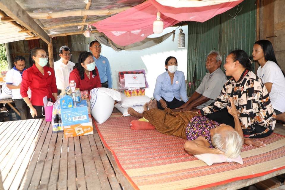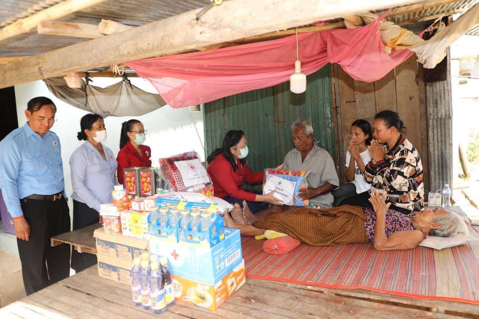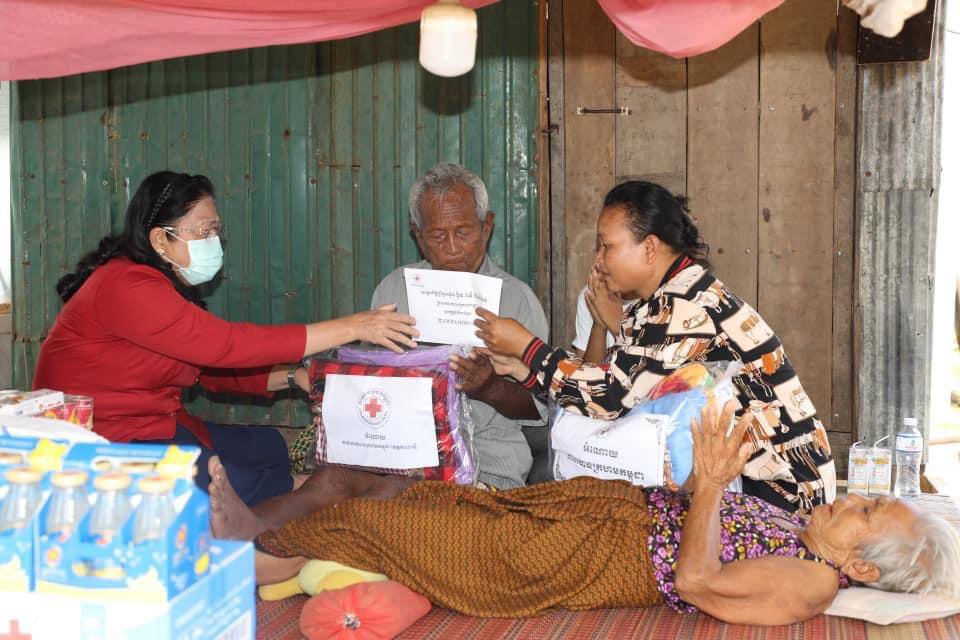 កំពង់ស្ពឺ ៖ សម្តេចកិត្តិព្រឹទ្ធបណ្ឌិត ប៊ុន រ៉ានី ហ៊ុនសែន ប្រធានកាកបាទក្រហមកម្ពុជា នៅថ្ងៃទី ១១ ខែវិច្ឆិកា ឆ្នាំ២០២២ បានចាត់ឱ្យលោកជំទាវ ម៉ែន នារីសោភ័គ អគ្គលេខាធិការរងទី ១ កាកបាទក្រហមកម្ពុជារួមជាមួយសាខាកាកបាទក្រហមកម្ពុជា ខេត្តកំពង់ស្ពឺ ចុះសួរសុខទុក្ខ និងនាំ យកអំណោយមនុស្សធម៌ជាគ្រឿងឧបភោគបរិភោគ ភេសជ្ជៈ និងថវិកាមួយចំនួន ជូនដល់លោកយាយ ស៊ុម នឹម អាយុ ៨៦ឆ្នាំ មានជំងឺប្រចាំកាយ និង លោកតា ពេជ្រ ធន់ អាយុ ៨៤ឆ្នាំ ពិការភ្នែក ដែលត្រូវជាប្តីប្រពន្ធនឹងគ្នា រស់នៅជាមួយគ្នាយ៉ាង លំបាក ខណៈដែលកូនស្រីរបស់គាត់ ជាស្ត្រី មេម៉ាយ កូន ៥នាក់ មិនទាន់ស្វែងរកការងារធ្វេី បាន បន្ទាប់ពីវិបត្តិកូវីដ-១៩។ បច្ចុប្បន្នគ្រួសារខាងលេីនេះរស់នៅភូមិអន្លង់គង់ ឃុំត្រពាំងគង ស្រុកសំរោងទង ខេត្តកំពង់ស្ពឺ។