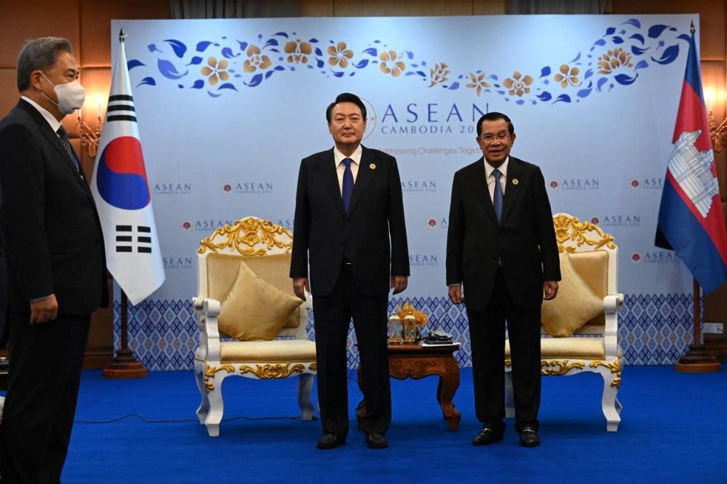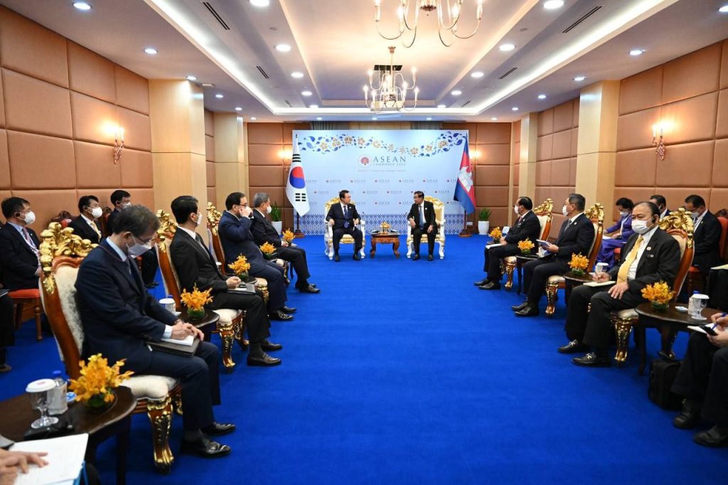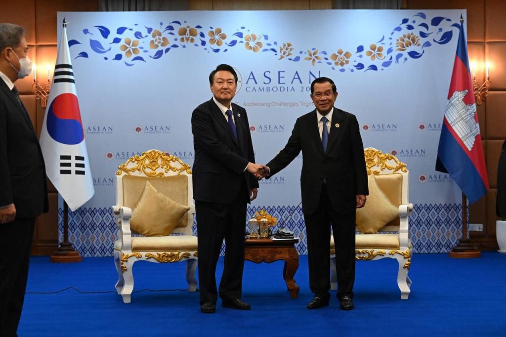 ភ្នំពេញ៖ សម្តេចអគ្គមហាសេនាបតីតេជោ ហ៊ុន សែន នាយករដ្ឋមន្រ្តី នៃព្រះរាជាណាចក្រកម្ពុជា និងជាប្រធានអាស៊ាន បានទទួលជួបពិភាក្សា ការងារជាមូយឯកឧត្តម យូន ស៊ុកយុល (Yoon Suk-yeol) ប្រធានាធិបតីកូរ៉េខាងត្បូង នា រសៀលថ្ងៃទី១១ ខែវិច្ឆិកា ឆ្នាំ២០២២ ។