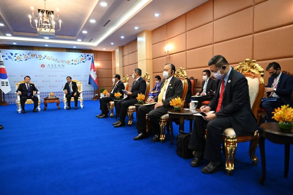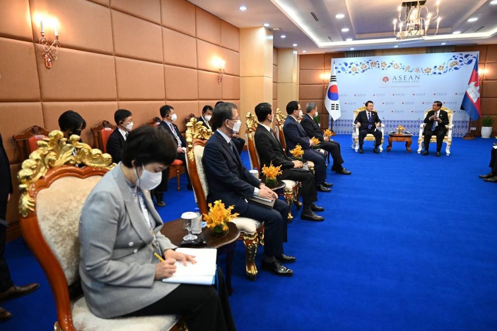 នៅក្នុងជំនួបនេះ ថ្នាក់ដឹកនាំទាំងពីរ បានពិភាក្សា គ្នាលើបញ្ហាទ្វេភាគីផង និងបញ្ហាតំបន់ផង។ ឯកឧត្តម ប្រធានាធិបតីកូរ៉េខាងត្បូង បានសម្តែង នូវការគាំទ្រមជ្ឈភាពអាស៊ាន និងសម្តែងនូវការ ពេញចិត្តចំពោះកិច្ចសហប្រតិបត្តការទំនាក់ទំនងរវាងរដ្ឋាភិបាល និងរដ្ឋាភិបាល វិស័យឯកជន និងវិស័យឯកជន ប្រជាជន និងប្រជាជន ។