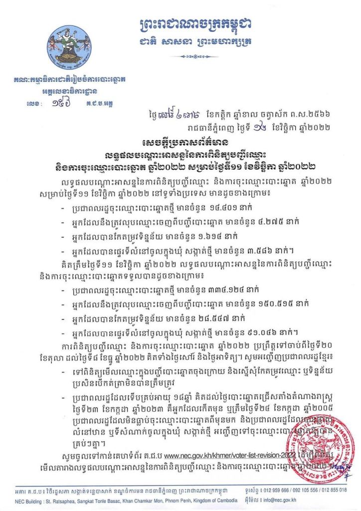 គ.ជ.ប ប្រកាសពីលទ្ធផលនៃការពិនិត្យបញ្ជីឈ្មោះ និងការចុះឈ្មោះបោះឆ្នោតឆ្នាំ២០២២ សំរាប់ថ្ងៃទី១១ វិច្ឆិកា, ពលរដ្ឋចុះឈ្មោះបោះឆ្នោតថ្មី ១៤ ៤០១នាក់ទៀតOne-Minuteអត្ថបទដោយ៖AMS OneMinute #ams1minute AMS OneMinuteអត្ថបទមុនអត្ថបទបន្ទាប់