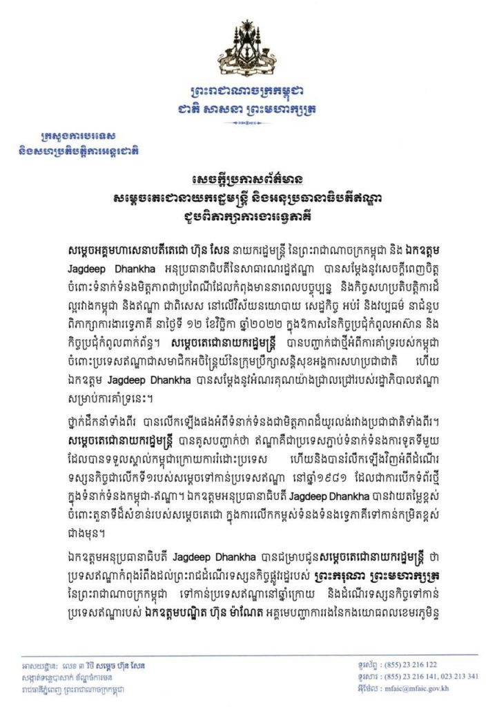 លទ្ធផលទេ្វភាគីរវាង សម្តេចតេជោនាយករដ្ឋមន្រ្តីកម្ពុជា និងអនុប្រធានាធិបតីឥណ្ឌាOne-Minuteអត្ថបទដោយ៖AMS OneMinute #ams1minute AMS OneMinuteអត្ថបទមុនអត្ថបទបន្ទាប់