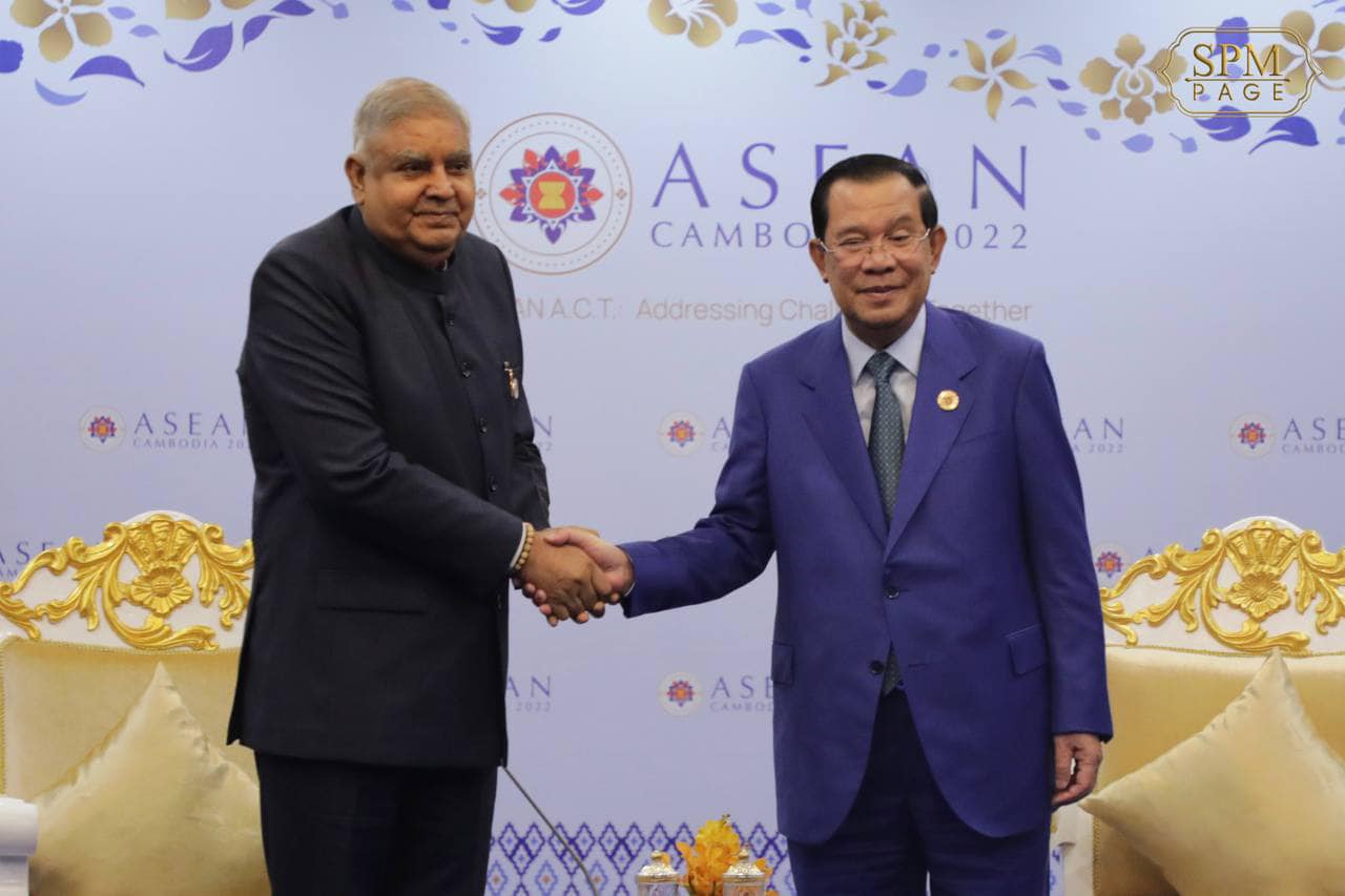 ភ្នំពេញ៖ សម្តេចអគ្គមហាសេនាបតីតេជោ ហ៊ុន សែន នាយករដ្ឋមន្រ្តី នៃព្រះរាជាណាចក្រកម្ពុជា និង ឯកឧត្តម Jagdeep Dhankha អនុប្រធានាធិបតីនៃសាធារណរដ្ឋឥណ្ឌា បានសម្តែងនូវសេចក្តីពេញចិត្តចំពោះទំនាក់ទំនងមិត្តភាពជាប្រពៃណីដែលកំពុងមាននាពេលបច្ចុប្បន្ន និងកិច្ចសហប្រតិបត្តិការដ៏ល្អរវាងកម្ពុជា និងឥណ្ឌា ជាពិសេស នៅលើវិស័យនយោបាយ សេដ្ឋកិច្ច អប់រំ និងវប្បធម៌ នាជំនួបពិភាក្សាការងារទ្វេភាគី នាថ្ងៃទី១២ ខែវិច្ឆិកា ឆ្នាំ២០២២ ក្នុងឱកាសនៃកិច្ចប្រជុំកំពូលអាស៊ាន និងកិច្ចប្រជុំកំពូលពាក់ព័ន្ធ។ សម្តេចតេជោនាយករដ្ឋមន្ត្រី បានបញ្ជាក់ជាថ្មីអំពីការគាំទ្ររបស់កម្ពុជាចំពោះប្រទេសឥណ្ឌាជាសមាជិកអចិន្រ្តៃយ៍នៃក្រុមប្រឹក្សាសន្តិសុខអង្គការសហប្រជាជាតិ ហើយឯកឧត្តម Jagdeep Dhankha បានសម្តែងនូវអំណរគុណយ៉ាងជ្រាលជ្រៅរបស់រដ្ឋាភិបាលឥណ្ឌា សម្រាប់ការគាំទ្រនេះ។