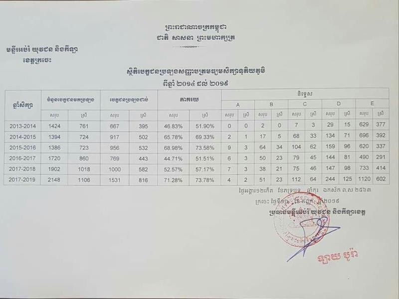 ក្រចេះ៖ មន្ទីរអប់រំ យុវជន និងកីឡាខេត្តក្រចេះ បានឲ្យដឹងថា លទ្ធផលប្រឡងសញ្ញាបត្រមធ្យមសិក្សាទុតិយភូមិ ឬ បាក់ឌុប មានបេក្ខជនប្រឡងជាប់ ចំនួន១៥៣១នាក់ (ស្រី៨១៦នាក់) ស្មើនឹង៧១,២៨% (បើប្រៀបធៀបនឹងឆ្នាំ២០១៨ កន្លងទៅគឺមានកាកើនឡើង ដោយឆ្នាំ២០១៨ មានចំនួន៥២,៥៧ % ) ដោយឡែកសម្រាប់បេក្ខជនប្រឡងជាប់និទ្ទេស A ធ្លាក់ចុះវិញ ដោយក្នុងឆ្នាំ២០១៨មានចំនួន០៧នាក់។