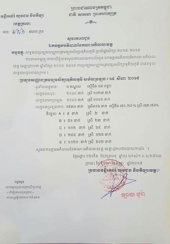 លទ្ធផលប្រឡងសញ្ញាបត្រមធ្យមសិក្សាទុតិយភូមិ ឆ្នាំ២០១៩នេះ បេក្ខជន ដែលទទួលបាន និទ្ទេស Aមានចំនួន៤នាក់ (ស្រី១នាក់) និទ្ទេសB មានចំនួន៥១នាក់ (ស្រី២៣នាក់) និទ្ទេស C មានចំនួន ១១២នាក់នាក់ (ស្រី៦៤នាក់) និទ្ទេស D មានចំនួន២៤៤នាក់ (ស្រី១២៥នាក់) និងនិទ្ទេស E មានចំនួន១,១២០នាក់ (ស្រី៦០២នាក់)។