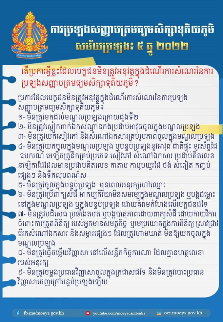 ភ្នំពេញ៖ ក្រសួងអប់រំ យុវជន និង កីឡា បានចេញនូវប្រការហាមឃាត់ចំនួន ១៦ចំណុច ដល់បេក្ខជនត្រូវ ប្រឡងសញ្ញាបត្រមធ្យមសិក្សាទុតិយភូមិឬហៅបាក់ឌុបនៅថ្ងៃទី ០៥ ខែ ធ្នូ ឆ្នាំ ២០២២ខាងមុខនេះ។