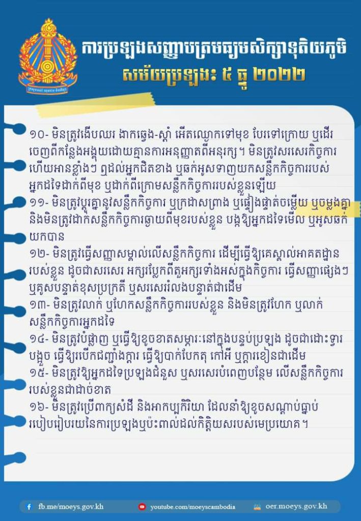 ១១- មិនត្រូវប្តូរគ្នានូវសន្លឹកកិច្ចការ ឬក្រដាសព្រាង ឬផ្ទៀងផ្ទាត់ចម្លើយ ឬចម្លងគ្នា និងមិនត្រូវដាក់សន្លឹកកិច្ចការឆ្ងាយពីមុខរបស់ខ្លួន បង្កឱ្យអ្នកដទៃមើល ឬអូសឆក់ យកបាន