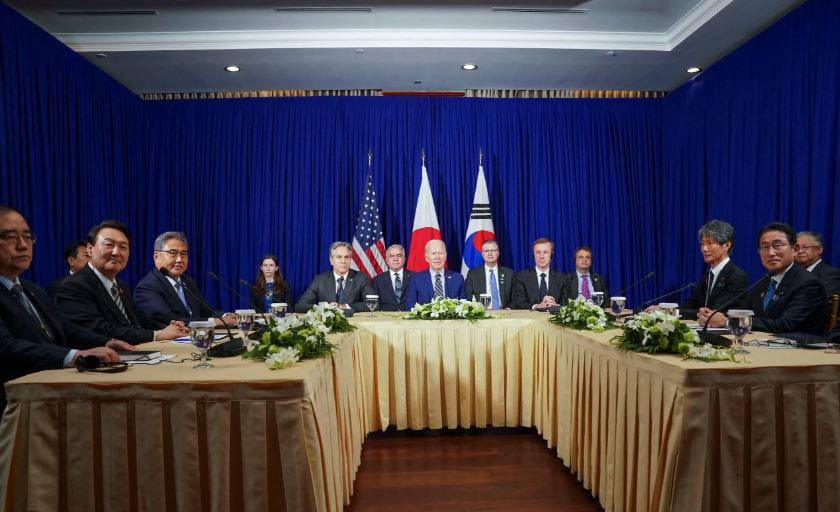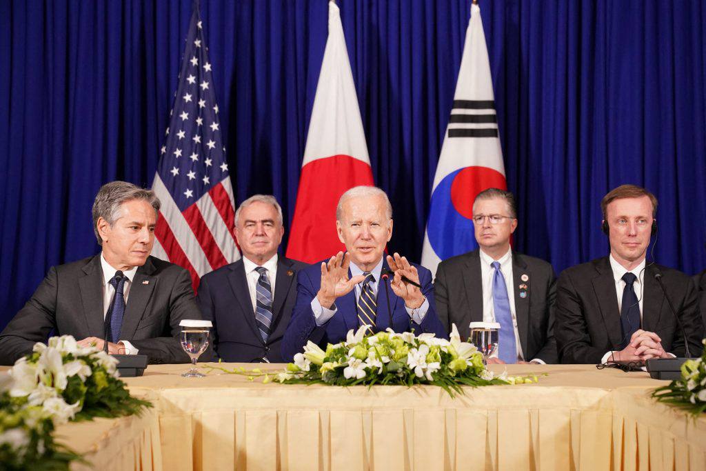 ប្រធានាធិបតីអាមេរិក លោក ចូ បៃដិន នាយករដ្ឋមន្ត្រីជប៉ុន លោក ហ៊្វូមីអូ គីស៊ីដា និងប្រធានាធិបតីកូរ៉េខាងត្បូង លោក យូន សុកយុល បានចេញសេចក្តីថ្លែងការណ៍រួមមួយ បន្ទាប់ពីកិច្ចប្រជុំនៅខាងក្រៅកិច្ចប្រជុំកំពូលអាស៊ាននៅថ្ងៃអាទិត្យទី១៣ ខែវិច្ឆិកា ឆ្នាំ២០២២។ សេចក្តីថ្លែងការណ៍នេះបានបញ្ជាក់ថា ការបាញ់មីស៊ីលផ្លោងក្នុងចំនួនដ៏ច្រើនមិនធ្លាប់មានរបស់កូរ៉េខាងជើងក្នុងឆ្នាំនេះ បានបង្កការគំរាមកំហែងយ៉ាងធ្ងន់ធ្ងរដល់សន្តិភាព និងសន្តិសុខនៅលើឧបទ្វីបកូរ៉េ និងលើសពីនេះទៅទៀត។