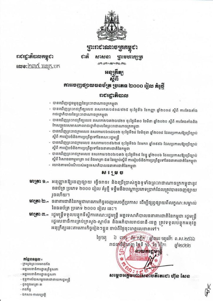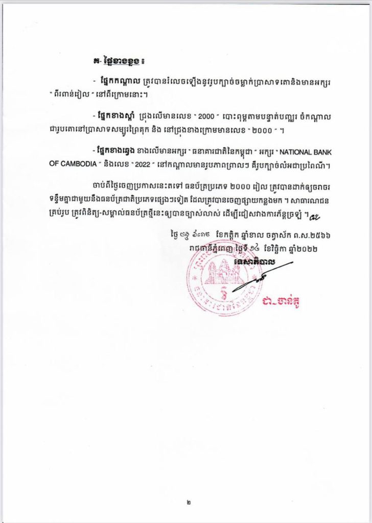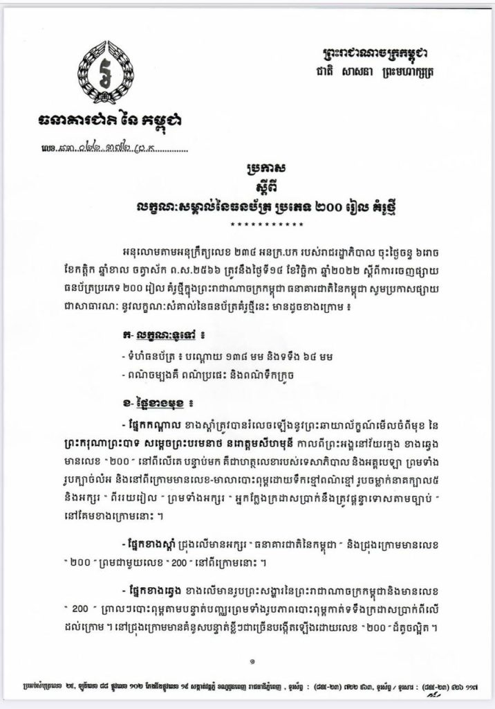 រាជរដ្ឋាភិបាលកម្ពុជា ចេញអនុក្រឹត្យសម្រេច ដាក់ឲ្យចរាចរក្រដាសប្រាក់ ២០០រៀល គំរូថ្មីជាផ្លូវការ ចាប់ពីថ្ងៃទី១៤ ខែវិច្ឆិកា ឆ្នាំ២០២២