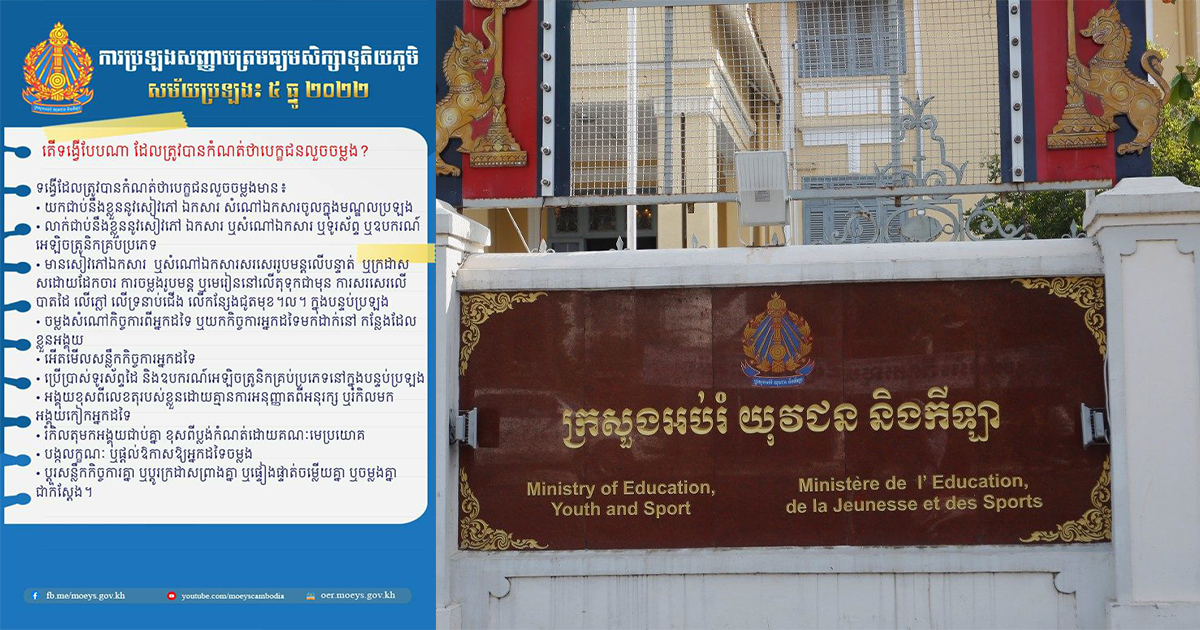 ភ្នំពេញ៖ ក្នុងខណៈពេលការប្រឡងសញ្ញាបត្រមធ្យមសិក្សាទុតិយភូមិ ឬ ហៅបាក់ ឌុប នៅថ្ងៃទី ០៥ ខែ ធ្នូ ឆ្នាំ ២០២២ កាន់តែខិតជិតមកដល់ក្រសួងអប់រំយុវជន និង កីឡាបានធ្វើការបង្ហាញពីកំហុស និងទង្វើមួយចំនួនដែលក្រសួងចាត់ទុកថាខុសវិន័យ ហើយអាចឈានទៅដល់ការដាក់ទោសកំហុសនាំឱ្យត្រូវធ្លាក់ជាស្វ័យប្រវត្តិ។