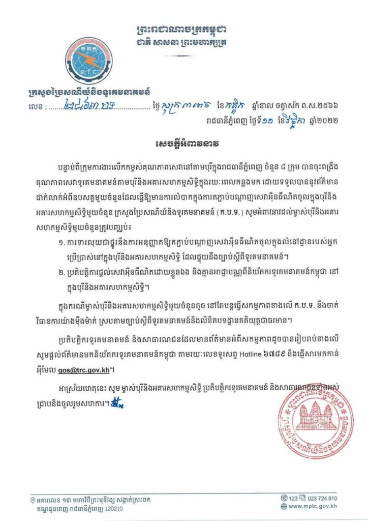 យោងតាមសេចក្តីអំពាវនាវរបស់ក្រសួងប្រៃសណីយដែលបានបង្ហោះក្នុងទំព័រហ្វេសប៊ុកផ្លូវការរបស់ខ្លួនៅថ្ងៃទី១៤ ខែ វិច្ឆិកា ឆ្នាំ ២០២២នេះបានបញ្ជាក់ថា៖បន្ទាប់ពី ក្រុមការងារលើកកម្ពស់ គុណភាពសេវានៅតាមបុរី ក្នុងរាជធានីភ្នំពេញ ចំនួន ៨ ក្រុម បាន ចុះពង្រឹងគុណភាពសេវា ទូរគមនាគមន៍ តាមបុរីនិងអគារសហកម្មសិទ្ធិក្នុងរយៈពេលកន្លងមក ដោយ ទទួល បាន នូវ ព័ត៌មាន ជាក់ លាក់ អំពីឧបសគ្គមួយចំនួន ដែល ធ្វើឱ្យ មានការលំបាក ក្នុងការ តភ្ជាប់ បណ្តាញសេវា អ៊ីនធឺណិត ចូលក្នុងបុរី និងអគារសហកម្មសិទ្ធិមួយចំនួន ក្រសួងប្រៃសណីយ៍និងទូរគមនាគមន៍ (ក.ប.ទ.) សូមអំពាវនាវ ដល់ម្ចាស់បុរីនិង អគារសហកម្មសិទ្ធិមួយចំនួន ត្រូវបញ្ឈប់៖