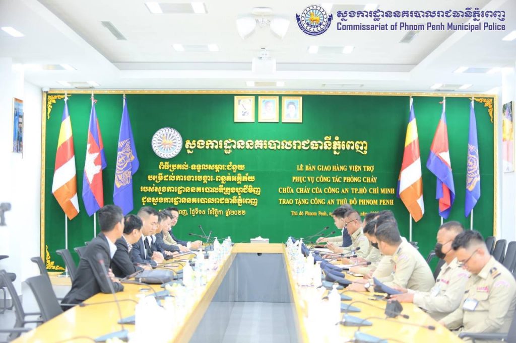 ភ្នំពេញ ៖ នៅព្រឹកថ្ងៃទី១៥ ខែវិច្ឆិកា ឆ្នាំ២០២២ ស្នងការដ្ឋាននគរបាលរាជធានីភ្នំពេញ មានរៀបចំពិធីប្រគល់-ទទួលសម្ភារបម្រើដល់ការងារបង្ការ-ពន្លត់អគ្គិភ័យរបស់ស្នងការដ្ឋាននគរបាលទីក្រុងហូជីមិញ ក្រោមការដឹកនាំរបស់ឯកឧត្តមឧត្តមសេនីយ៍ត្រី ស៊ុម សុឃីម ស្នងការរង និងជាតំណាងឯកឧត្តមឧត្តមសេនីយ៍ឯក ស ថេត អគ្គស្នងការរងនគរបាលជាតិ និងជាស្នងការនគរបាលរាជធានីភ្នំពេញ និងលោកវរសេនីយ៍ឯក ម៉ៃ ហ័ង ស្នងការរងនៃស្នងការដ្ឋាននគរបាលទីក្រុងហូជីមិញ។