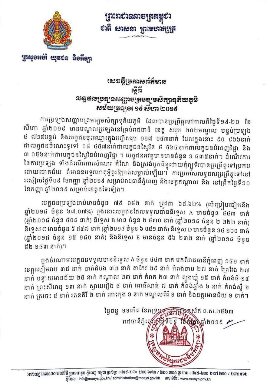 លទ្ធផលប្រឡងបាក់ឌុបទូទាំងប្រទេស បានចេញជាផ្លូវការហើយ ក្នុងនោះសិស្សប្រឡប់ ជាប់និទ្ទេសអេ និងនិ ទ្ទេសប៊ី មានចំនួនច្រើនជាងឆ្នាំ២០១៨។ យោងតាមសេចក្តីប្រកាសព័ត៌មានរបស់ក្រសួងអប់រំថ្ងៃទី៩កញ្ញានេះ បេក្ខជនប្រលងមធ្យមសិក្សាទុតិយភូមិ បាក់ឌុប នៅឆ្នាំ២០១៩នេះ ជាប់សរុប ៧ម៉ឺន៩ពាន់៥២នាក់ ស្មើនឹង ៦៨.៦២% ។ ក្រសួងអប់រំបានបង្ហាញថា ចំនួននេះច្រើនជាងឆ្នាំ២០១៨ ដែលមានតែ៦៧.០៧%។ និស្សិតម្នាក់ ដែលប្រឡងជាប់និទ្ទេសអេ បានសម្តែងក្តីរំភើបរីករាយក្នុងពេលឃើញលទ្ធផលថ្ងៃនេះ