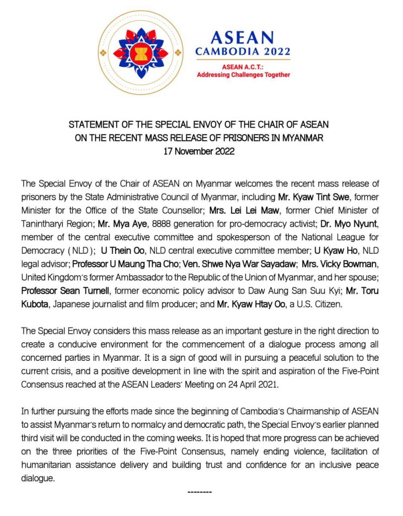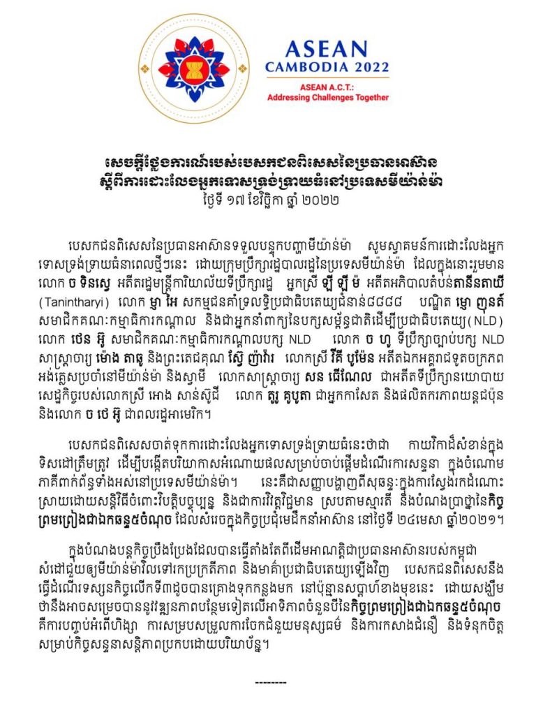 កម្ពុជា ប្រធានអាស៊ាន ប្រកាសស្វាគមន៍ការដោះលែងអ្នកទោសទ្រង់ទ្រាយធំនៅមីយ៉ាន់ម៉ាOne-Minuteអត្ថបទដោយ៖AMS OneMinute #ams1minute AMS OneMinuteអត្ថបទមុនអត្ថបទបន្ទាប់