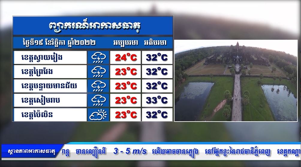 ព្យាករណ៌អាកាសធាតុ សម្រាប់ថ្ងៃទី១៩ វិច្ឆិកា ២០២២ (មានវីដេអូ)