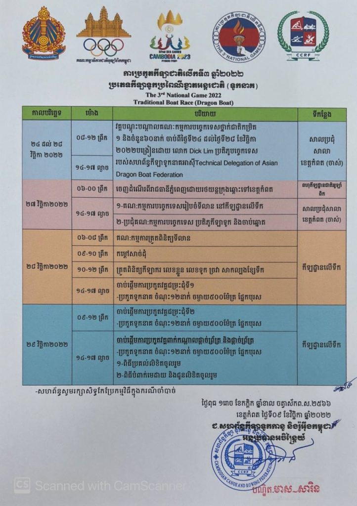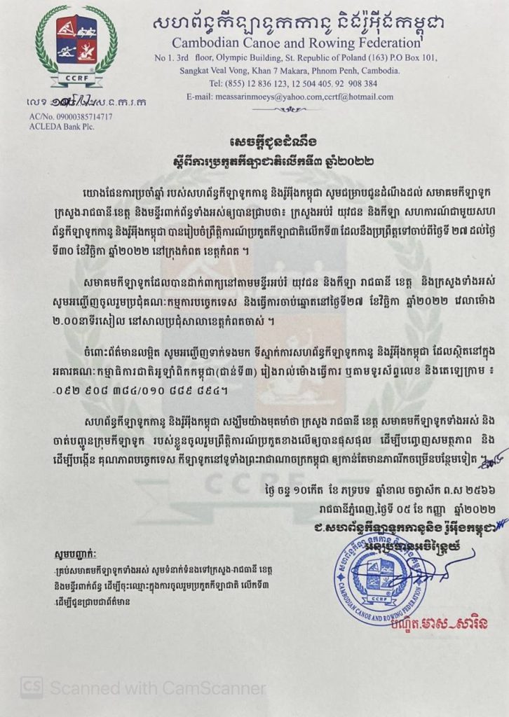 ភ្នំពេញ៖យោងតាមសេចជូនដំណឹងដែលបានប្រកាសនូវលើផេកហ្វេសបុកផ្លូវការរបស់សហព័ន្ធកីឡាទូកកានូ និងរ៉ូអ៊ីងកម្ពុជា បានប្រកាសថា ព្រឹត្តិការណ៍កីឡាជាតិលើកទី៣ ដែលជាព្រឹត្តិការណ៍ធំ រៀបចំដោយក្រសួងអប់រំយុវជន និងកីឡា នឹងរៀបចំការប្រកួតរយៈពេល៤ថ្ងៃ ចាប់ពីថ្ងៃទី២៧ដល់៣០ ខែ វិច្ឆិកា ឆ្នាំ២០២២ នៅដងព្រែក ខេត្ត កំពត ក្រុង កំពត។