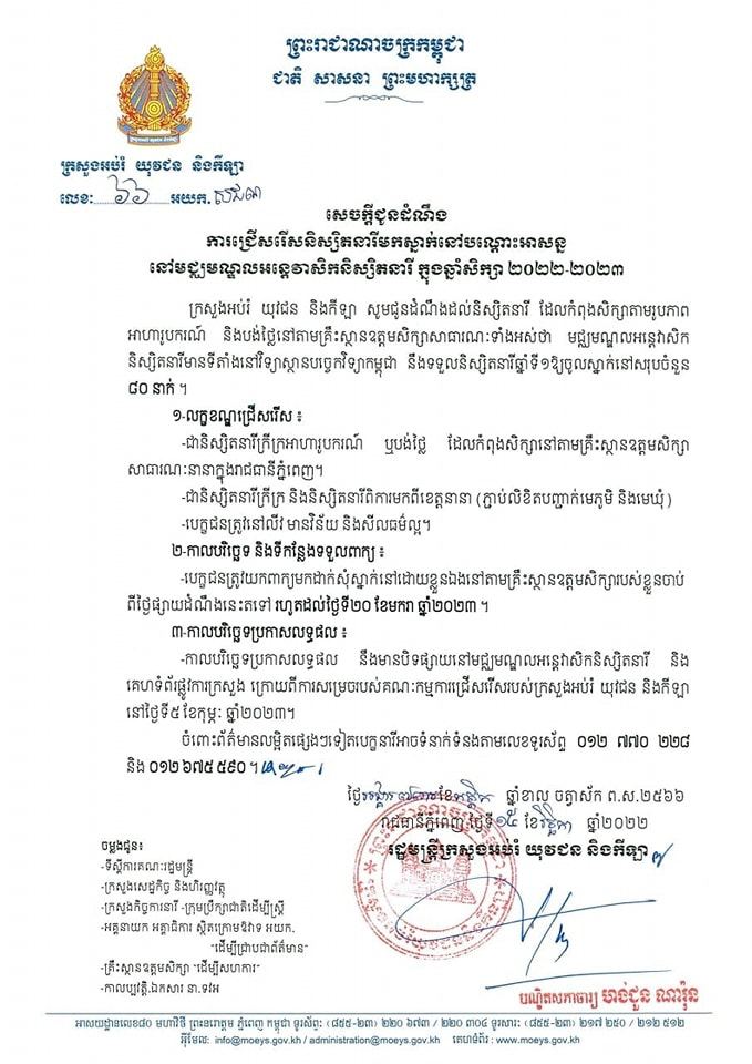 បណ្ឌិតសភាចារ្យ ហង់ជួន ណារ៉ុន រដ្ឋមន្រ្តីក្រសួងអប់រំ យុវជន និងកីឡា បានបញ្ជាក់តាមរយៈសេចក្តីជូនដំណឹងចុះថ្ងៃទី១៥ ខែវិច្ឆិកា ដោយក្រសួងធ្វើការជ្រើសរើសនិសិ្សតនារីឆ្នាំទី១ ដែលមានជីវភាពក្រីក្រមកស្នាក់នៅក្នុងអន្តេវាសិកនិស្សិតនារីនេះ ចាប់ពីថ្ងៃជូនដំណឹងរហូតដល់ថ្ងៃទី២០ខែមករាឆ្នាំ២០២៣ ខាងមុខ។