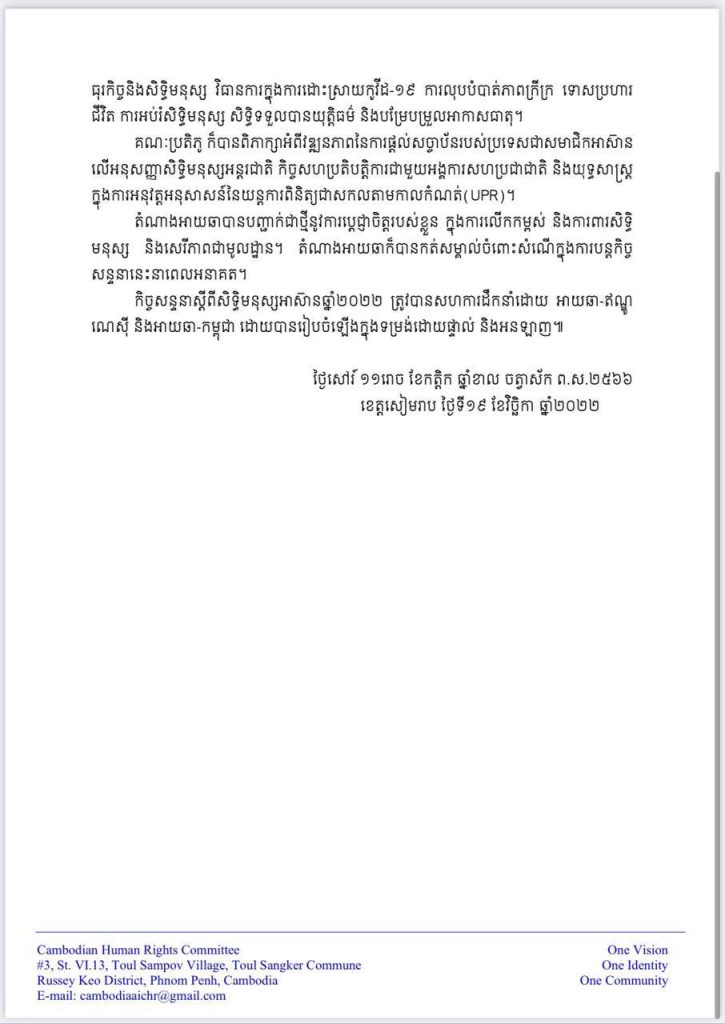 កិច្ចសន្ទនាស្តីពីសិទ្ធិមនុស្សអាស៊ានឆ្នាំ២០២២ ត្រូវបានសហការដឹកនាំដោយ អាយឆា-ឥណ្ឌូ ណេស៊ី និងអាយឆា-កម្ពុជា ដោយបានរៀបចំឡើងក្នុងទម្រង់ដោយផ្ទាល់ និងអនឡាញ៕