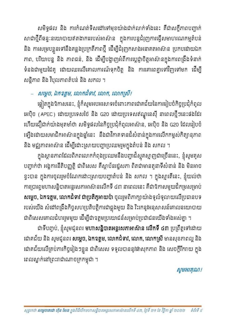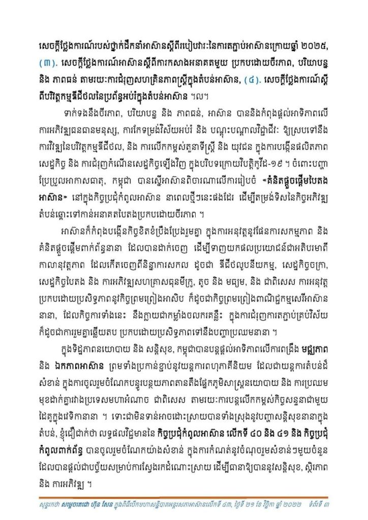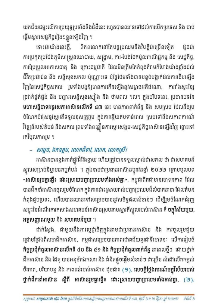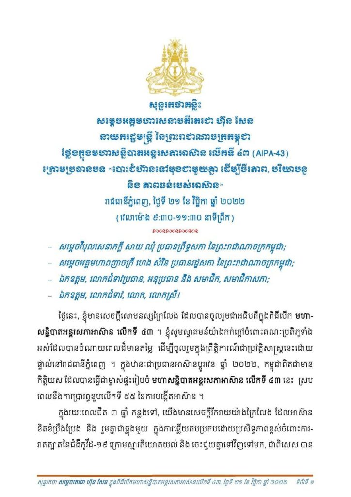 សុន្ទរកថាគន្លឹះរបស់សម្តេចតេជោ ហ៊ុន សែន នាយករដ្ឋមន្ត្រីកម្ពុជា ក្នុងឱកាសបើកមហាសន្និបាតអន្តរសភាអាស៊ាន លើកទី៤៣ (AIPA-43) នៅព្រឹកថ្ងៃទី២១ ខែវិច្ឆិកា ឆ្នាំ២០២២