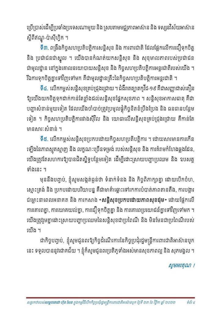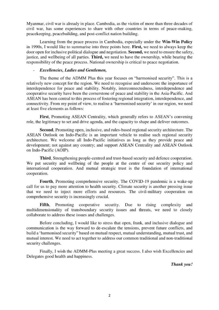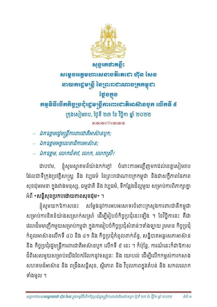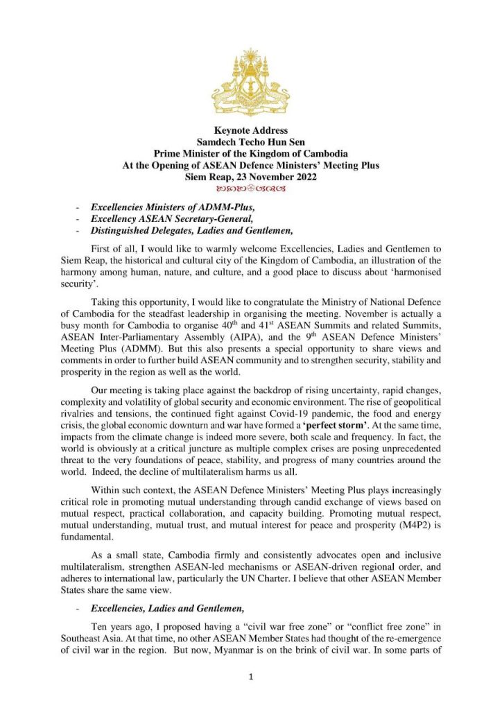 សុន្ទុរកថាគន្លឹះរបស់សម្តេចតេជោ ហ៊ុន សែន អញ្ជើញបើកកិច្ចប្រជុំរដ្ឋមន្ត្រីការពារជាតិអាស៊ាន បូកលើកទី៩