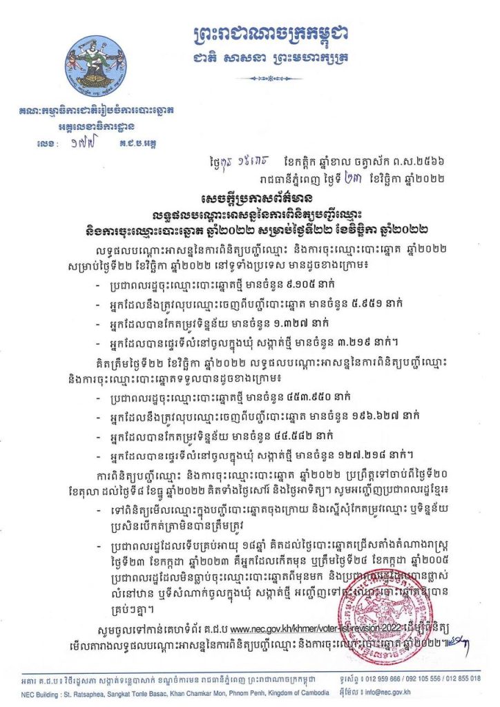 គ.ជ.ប ប្រកាសពីលទ្ធផលនៃការពិនិត្យបញ្ជីឈ្មោះ និងការចុះឈ្មោះបោះឆ្នោតឆ្នាំ២០២២ សំរាប់ថ្ងៃទី២២ វិច្ឆិកា, ពលរដ្ឋចុះឈ្មោះបោះឆ្នោតថ្មី ៩ ១០៥នាក់ទៀតOne-Minuteអត្ថបទដោយ៖AMS OneMinute #ams1minute AMS OneMinuteអត្ថបទមុនអត្ថបទបន្ទាប់