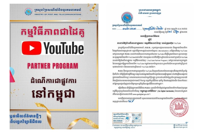 ភ្នំពេញ៖ ក្រសួងប្រៃសណីយ៍និងទូរគមនាគមន៍ (ក.ប.ទ.) នៅថ្ងៃទី ២៤ ខែវិច្ឆិកា ឆ្នាំ២០២២នេះបានចេញសេចក្តីប្រកាសមួយស្តីការដាក់ដាក់ឱ្យដំណើរការជាផ្លូវការ “កម្មវិធីភាពជាដៃគូ” របស់ក្រុមហ៊ុន YouTube។