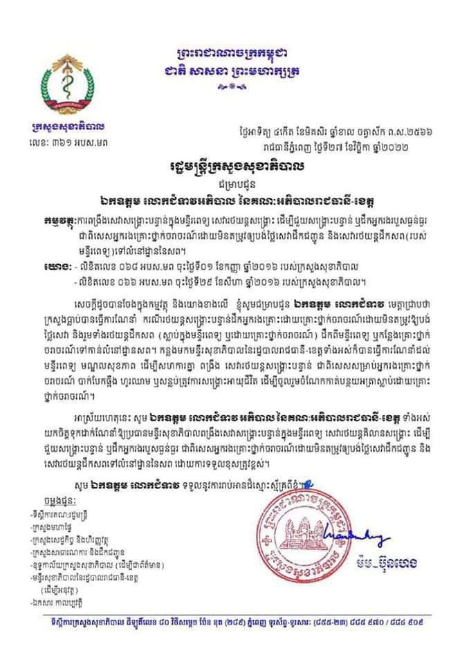 ភ្នំពេញ ៖ រដ្ឋមន្ត្រីក្រសួងសុខាភិបាល ជម្រាបជូន លោក លោកស្រី អភិបាល នៃគណៈអភិបាលរាជធានី-ខេត្ត គឺតម្រូវលើការពង្រឹងសេវាសង្គ្រោះបន្ទាន់ ក្នុងមន្ទីរពេទ្យ សេវារថយន្តសង្គ្រោះ ដើម្បីជួយសង្គ្រោះបន្ទាន់ ឬដឹកអ្នករងរបួសធ្ងន់ធ្ងរ ជាពិសេសអ្នករងគ្រោះថ្នាក់ចរាចរណ៍ ដោយមិនតម្រូវឱ្យបង់ថ្លៃសេវាដឹកជញ្ជូន និងសេវារថយន្តដឹកសព(របស់មន្ទីរពេទ្យ) ទៅលំនៅដ្ឋាននៃសព។