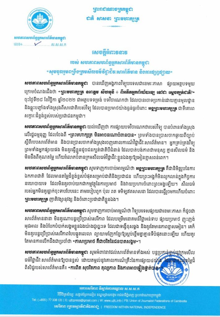 សហភាពសហព័ន្ធអ្នកសារព័ត៌មានកម្ពុជា សូមទាញការចាប់អារម្មណ៍ថា អង្គព្រះមហាក្សត្រ គឺជានិមិត្តរូបនៃការឯកភាពជាតិ ដែលមានតម្លៃដ៏ខ្ពង់ខ្ពស់បំផុតសម្រាប់ជាតិនិងប្រជាជន ហើយព្រះអង្គក៏មិនលូកលាន់ក្នុងកិច្ចការនយោបាយទេ ដែលមិនគួរចាប់យកជាកម្មវត្ថុនៃការប្រមាថ និងវាយប្រហារចំពោះព្រះអង្គឡើយ។ សីលធម៌របស់អ្នកមិនគួរធ្លាក់ចុះទាបបែបនេះ តាមរបៀបពួក ប៉ុល ពត ទមិឡឥតសាសនា ដែលបានធ្វើរួចមកហើយចំពោះ ព្រះមហាក្សត្រ ញាតិវង្សានុវង្ស និងចំពោះប្រជាជាតិខ្លួនឯង។