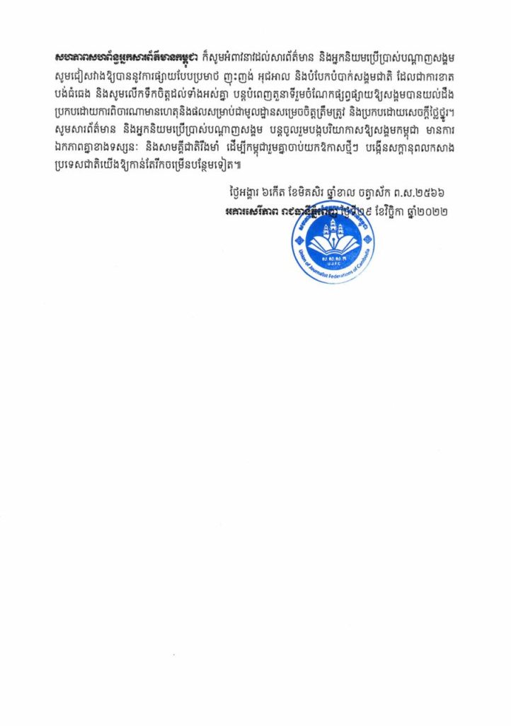 សហភាពសហព័ន្ធអ្នកសារព័ត៌មានកម្ពុជា ក៏សូមអំពាវនាវដល់សារព័ត៌មាន និងអ្នកនិយមប្រើប្រាស់បណ្តាញសង្គម សូមជៀសវាងឱ្យបាននូវការផ្សាយបែបប្រមាថ ញុះញង់ អុជអាល និងបំបែកបំបាក់សង្គមជាតិ ដែលជាការខាតបង់ធំធេង និងសូមលើកទឹកចិត្តដល់ទាំងអស់គ្នា បន្តបំពេញតួនាទីរួមចំណែកផ្សព្វផ្សាយឱ្យសង្គមបានយល់ដឹងប្រកបដោយការពិចារណាមានហេតុនិងផលសម្រាប់ជាមូលដ្ឋានសម្រេចចិត្តត្រឹមត្រូវ និងប្រកបដោយសេចក្តីថ្លៃថ្នូរ។ សូមសារព័ត៌មាន និងអ្នកនិយមប្រើប្រាស់បណ្តាញសង្គម បន្តចូលរួមបង្កបរិយាកាសឱ្យសង្គមកម្ពុជា មានការឯកភាពគ្នាខាងទស្សនៈ និងសាមគ្គីជាតិរឹងមាំ ដើម្បីកម្ពុជារួមគ្នាចាប់យកឱកាសថ្មីៗ បង្កើនសក្តានុពលកសាងប្រទេសជាតិយើងឱ្យកាន់តែរីកចម្រើនបន្ថែមទៀត៕