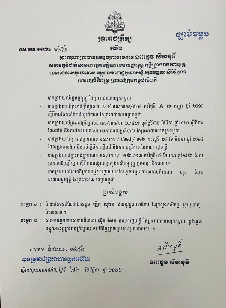 ព្រះមហាក្សត្រ ចេញព្រះរាជក្រឹត្យត្រាស់បង្គាប់តែងតាំងលោក យ៉ង សាំងកុមារ ជារដ្ឋមន្រ្តីប្រតិភូអមនាយករដ្ឋមន្រ្តី និងជារដ្ឋលេខាធិការ ក្រសួងកសិកម្ម និងលោក ឡឹក សុធារ តែងតាំងជា អនុរដ្ឋលេខាធិការក្រសួងកសិកម្មOne-Minuteអត្ថបទដោយ៖AMS OneMinute #ams1minute AMS OneMinuteអត្ថបទមុនអត្ថបទបន្ទាប់