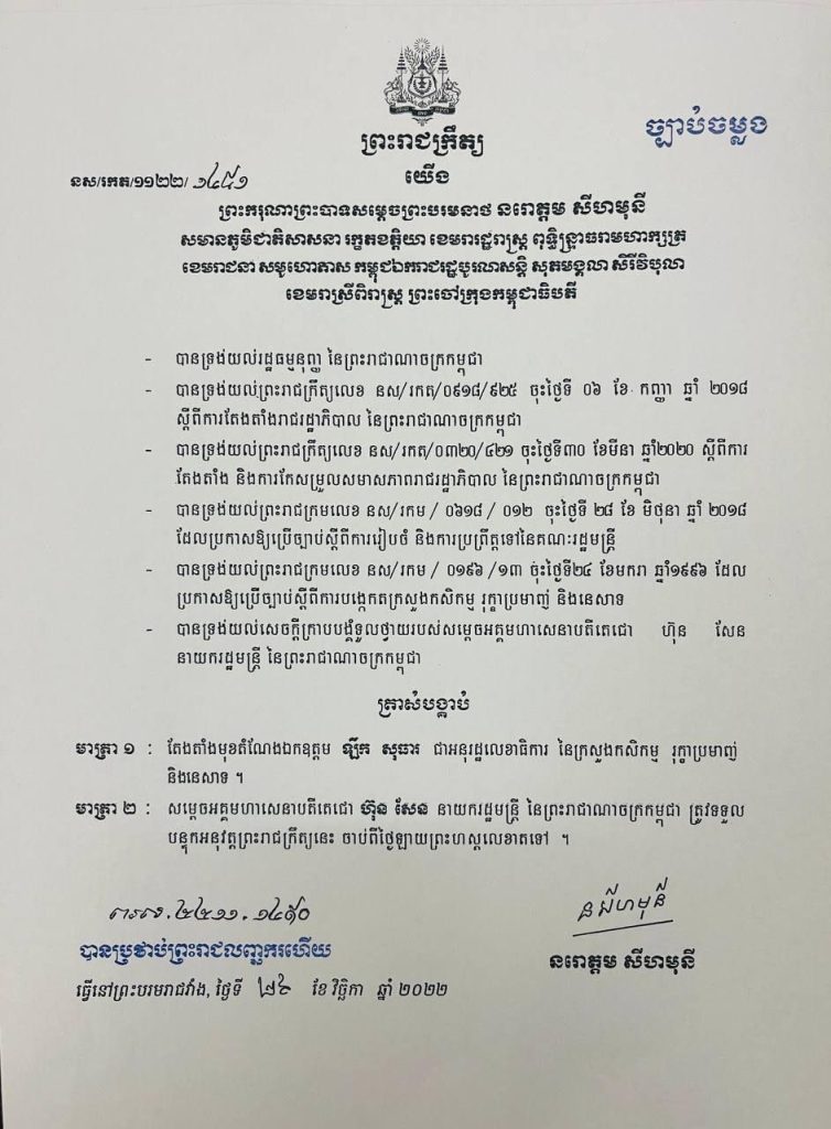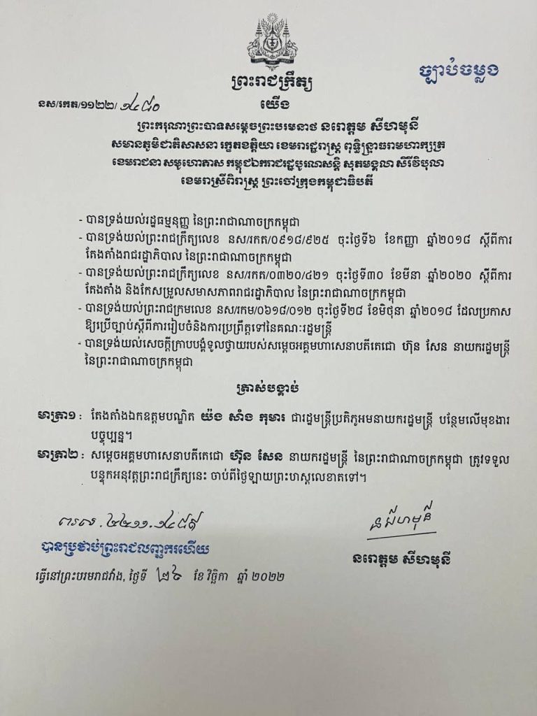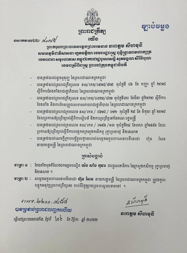 លោក យ៉ង សាំងកុមារ ត្រូវបានតែងតាំងជារដ្ឋលេខាធិការក្រសួងកសិកម្ម ខណៈលោក ឡឹក សុធារ តែងតាំងជាអនុរដ្ឋលេខាធិការ