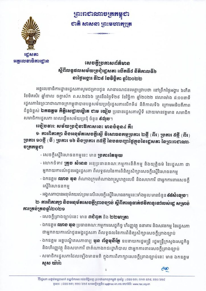 ភ្នំពេញ៖ រដ្ឋសភាបានអនុម័តលើសេចក្តីស្នើវិសោធនកម្មប្រការមួយចំនួន នៃបទបញ្ជាផ្ទៃក្នុងនៃរដ្ឋសភា សេចក្តីព្រាងច្បាប់ស្តីពីការទូទាត់ថវិកាទូទៅរបស់រដ្ឋសម្រាប់ការគ្រប់គ្រងឆ្នាំ២០២១ សេចក្តីព្រាងច្បាប់ ស្តីពីហិរញ្ញវត្ថុសម្រាប់ការគ្រប់គ្រងឆ្នាំ២០២៣ និងសេចក្តីព្រាងច្បាប់ស្តីពីការអនុម័តយល់ព្រមលើពិធីសារទាក់ទងនឹងការធ្វើវិសោធនកម្មអនុសញ្ញាស្តីពីអាកាសចរណ៍ស៊ីវិលអន្តរជាតិ។ ការអនុម័តនេះ បានធ្វើឡើងសម័យប្រជុំរដ្ឋសភាលើកទី៨ នីតិកាលទី៦ នៅថ្ងៃទី២៩ ខែវិច្ឆិកា ឆ្នាំ២០២២ ក្រោមអធិបតីភាពដ៏ខ្ពង់ខ្ពស់ឯកឧត្តម កិត្តិសេដ្ឋាបណ្ឌិត ជាម យៀប ប្រធានរដ្ឋសភាស្តីទី។
