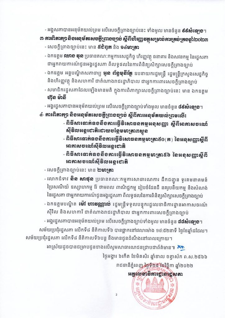 ៣- ការពិភាក្សា និងអនុម័តសេចក្តីព្រាងច្បាប់ ស្តីពីហិរញ្ញវត្ថុសម្រាប់ការគ្រប់គ្រងឆ្នាំ២០២៣ ៖ សេចក្តីព្រាងច្បាប់នេះ មាន ៥ជំពូក និង ១៤មាត្រា ត្រូវបានអង្គរដ្ឋសភាបានអនុម័តយល់ព្រម លើសេចក្តីព្រាងច្បាប់ទំាងមូល មានចំនួន ៨៩សំឡេង។
