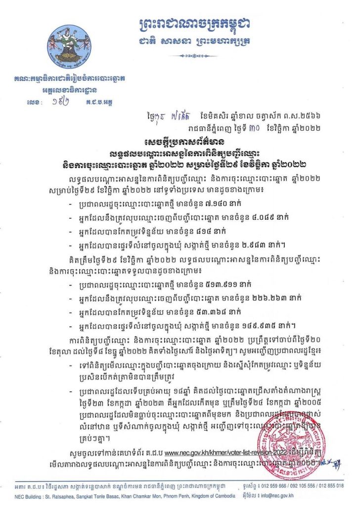 គ.ជ.ប ប្រកាសពីលទ្ធផលនៃការពិនិត្យបញ្ជីឈ្មោះ និងការចុះឈ្មោះបោះឆ្នោតឆ្នាំ២០២២ សំរាប់ថ្ងៃទី២៩ វិច្ឆិកា, ពលរដ្ឋចុះឈ្មោះបោះឆ្នោតថ្មី ៧ ១៤០នាក់ទៀតOne-Minuteអត្ថបទដោយ៖AMS OneMinute #ams1minute AMS OneMinuteអត្ថបទមុនអត្ថបទបន្ទាប់