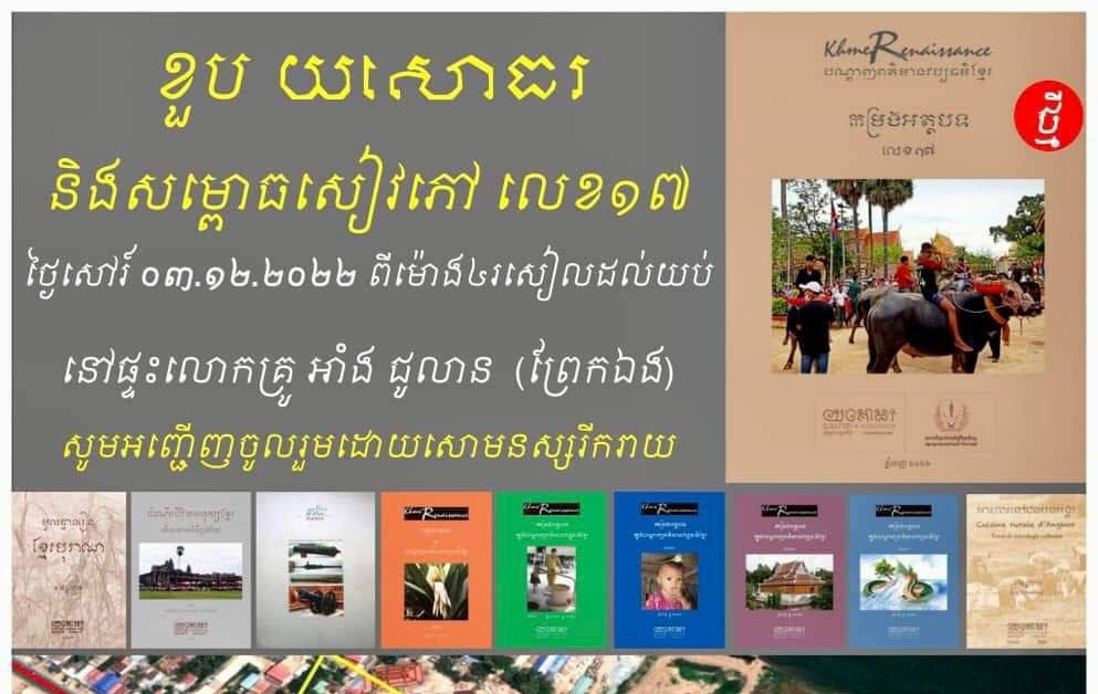 សៀវភៅបណ្ដាញព័ត៌មានវប្បធម៌ខ្មែរ លេខ១៧ បោះពុម្ពដោយអង្គការយសោធរ នឹងមានដាក់លក់ក្នុងកម្មវិធីសម្ពោធសៀវភៅក្នុងថ្ងៃទី៣ ខែធ្នូ ឆ្នាំ ២០២២ នៅគេហដ្ឋានលោកបណ្ឌិត អាំង ជូលាន ហើយនឹងមានលក់ក្នុងកម្មវិធីពិធីសៀវភៅប្រចាំឆ្នាំដែលរៀបចំដោយបណ្ដាល័យជានាថ្ងៃទី៩ ដល់ ១១ ខែធ្នូ ឆ្នាំ២០២២ នេះក្នុងបរិវេណបណ្ដាល័យជាតិ ខាងលិចវត្តភ្នំ។