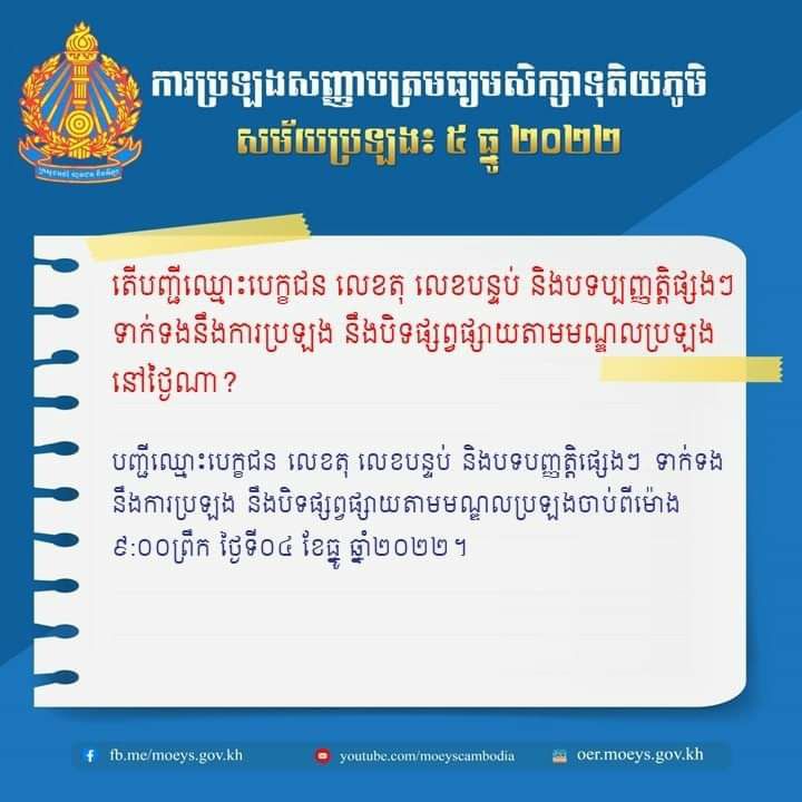 ក្រសួងអប់រំបានឱ្យដឹងទាក់ទិនក្នុងរឿងនេះថា”បញ្ជីឈ្មោះបេក្ខជន លេខតុ លេខបន្ទប់ និងបទបញ្ញត្តិផ្សេងៗ ទាក់ទង នឹងការប្រឡង នឹងបិទផ្សព្វផ្សាយតាមមណ្ឌលប្រឡងចាប់ពីម៉ោង ៩:០០ព្រឹក ថ្ងៃទី០៤ ខែធ្នូ ឆ្នាំ២០២២” ។