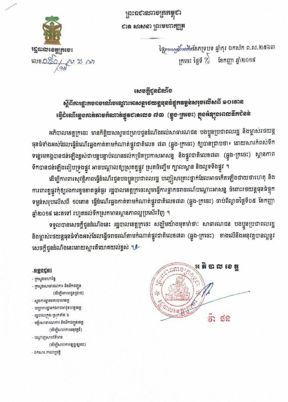 សូមបញ្ជាក់ថា យោងតាមរបាយការណ៍របស់មន្ទីរធនធានទឹក និងឧតុនិយមខេត្ត គិតត្រឹមថ្ងៃទី៦ ខែកញ្ញា ឆ្នាំ២០១៩នេះ កម្ពស់ទឹកនៅទន្លេមេគង្គខេត្តក្រចេះបានឡើងដល់២២,២០ម៉ែត្រ ដែលកម្ពស់ទឹកលើសពីចំណុចប្រកាសប្រុងប្រយត្ន័ ត្រឹមតែ២២,០០ម៉ែត្រប៉ុណ្ណោះ៕ម.ន